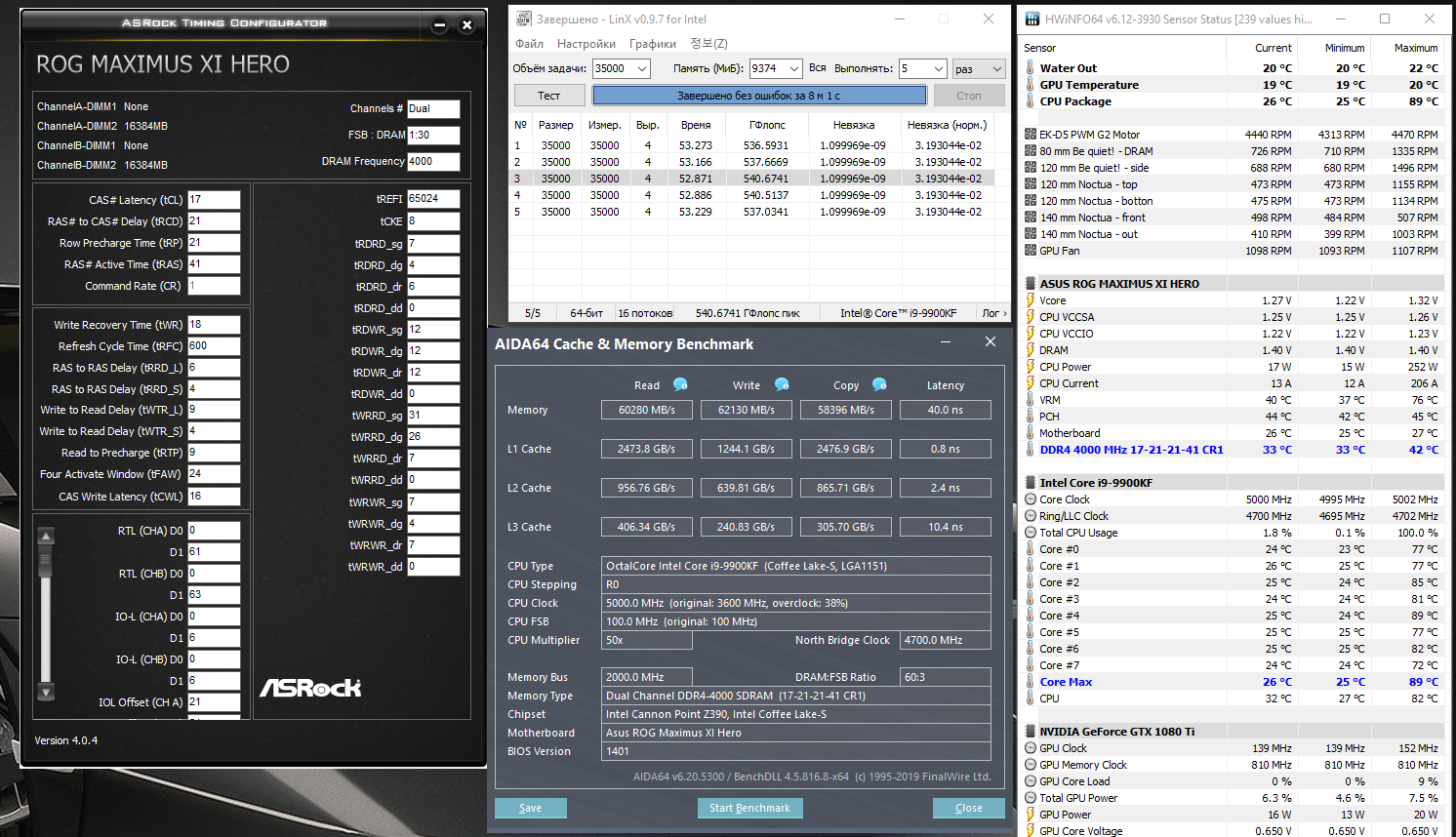 Полученный результат должен иметь следующий вид: Скриншот рабочего стола после прохождения >9 циклов (т.е. между 9 и 10 проходами). Вместе с LinX на рабочем столе должны быть развернуты CPU-Z (первая вкладка) и Core Temp, это обязательный минимум. Такой набор программ даст информацию о напряжении и температурах под нагрузкой-простоем. По желанию можете добавить другие программы, показывающие дополнительную информацию о вашей системе, например третью вкладку CPU-Z, которая покажет модель материнской платы и версию BIOS. Пример результата разгона: Mad Max, 5100 МГц (AVX 0), i7-8086K, HT-ON, Cache 4700, Vcore=1.36V, Batch L805E123, Gigabyte Z370 Aorus Gaming 7 (bios F6), Be Quiet! Dark Rock Pro 4, ЖМ под HS, Windows 10 Pro 64-bit 1809, LinX 0.9.3 64bit.