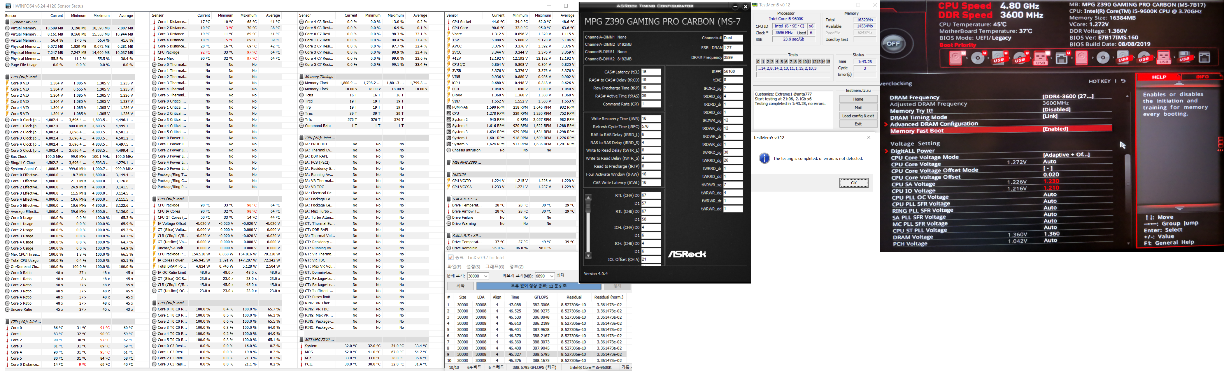 Полученный результат должен иметь следующий вид: Скриншот рабочего стола после прохождения >9 циклов (т.е. между 9 и 10 проходами). Вместе с LinX на рабочем столе должны быть развернуты CPU-Z (первая вкладка) и Core Temp, это обязательный минимум. Такой набор программ даст информацию о напряжении и температурах под нагрузкой-простоем. По желанию можете добавить другие программы, показывающие дополнительную информацию о вашей системе, например третью вкладку CPU-Z, которая покажет модель материнской платы и версию BIOS. Пример результата разгона: Mad Max, 5100 МГц (AVX 0), i7-8086K, HT-ON, Cache 4700, Vcore=1.36V, Batch L805E123, Gigabyte Z370 Aorus Gaming 7 (bios F6), Be Quiet! Dark Rock Pro 4, ЖМ под HS, Windows 10 Pro 64-bit 1809, LinX 0.9.3 64bit.
