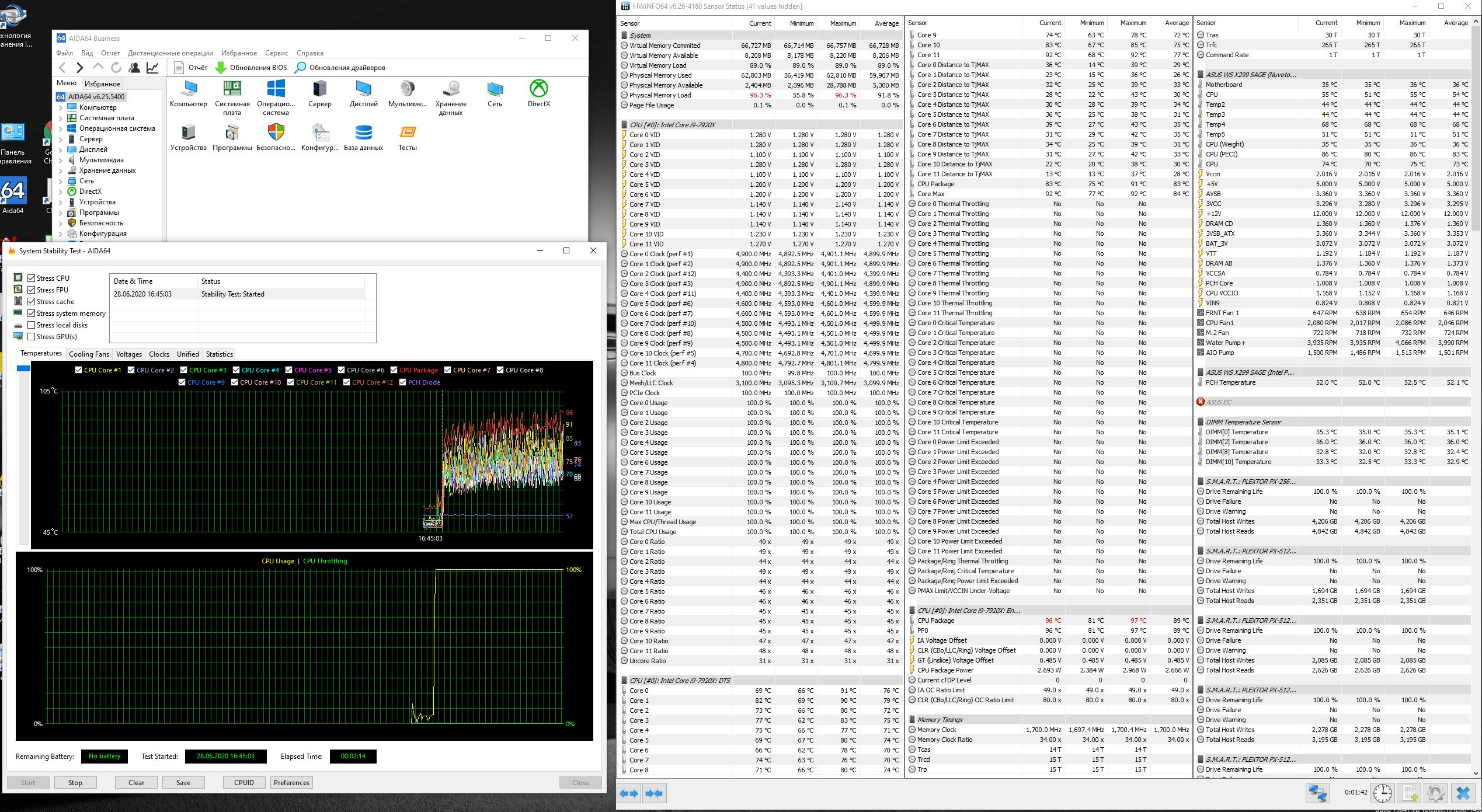 Alex TOPMAN Ну так у вас частоты скачут и питание за ними. У Вас какие то лимиты включены или еще что то. Если материнка ASUS, то как моя приедет, я сделаю мини гайд. Так же на фото не видно потребление ватт в пиках. Может у Вас уже упор в сокет(не все материнки могут отдавать больше 550 ватт в сокет) и тут не важно 1х8, 1х4+1х8, 2х8 или 500х8 разъемов дополнительного питания. Есть физические лимиты, который вы не отключите. Это как я понять не мог, почему на HERO Z370 у меня 9900к жрет всегда 200 ватт и не больше. Тут тоже самое. А потом знакомый написал, что у нее лимит по сокету 200 ватт и больше вы никак не дадите. Если у Вас "AsusX299_WS_SAGE" то чего вы удивляетесь ? У нее лимит дай бог 350 ватт(надеюсь, что больше). Тут 100% дело в материнке(не сразу глянул какая), мать под замену 100% ! У моей Томы от MSI лимит около 330-350 ватт(208 А) и все, я просто заказал новую мать, потому как 4.3-4.4Ghz по ядрам это крайне мало, я со своего 14 ядерника сниму столько, сколько позволит охлад(это минимум 4.7Ghz по всем ядрам)