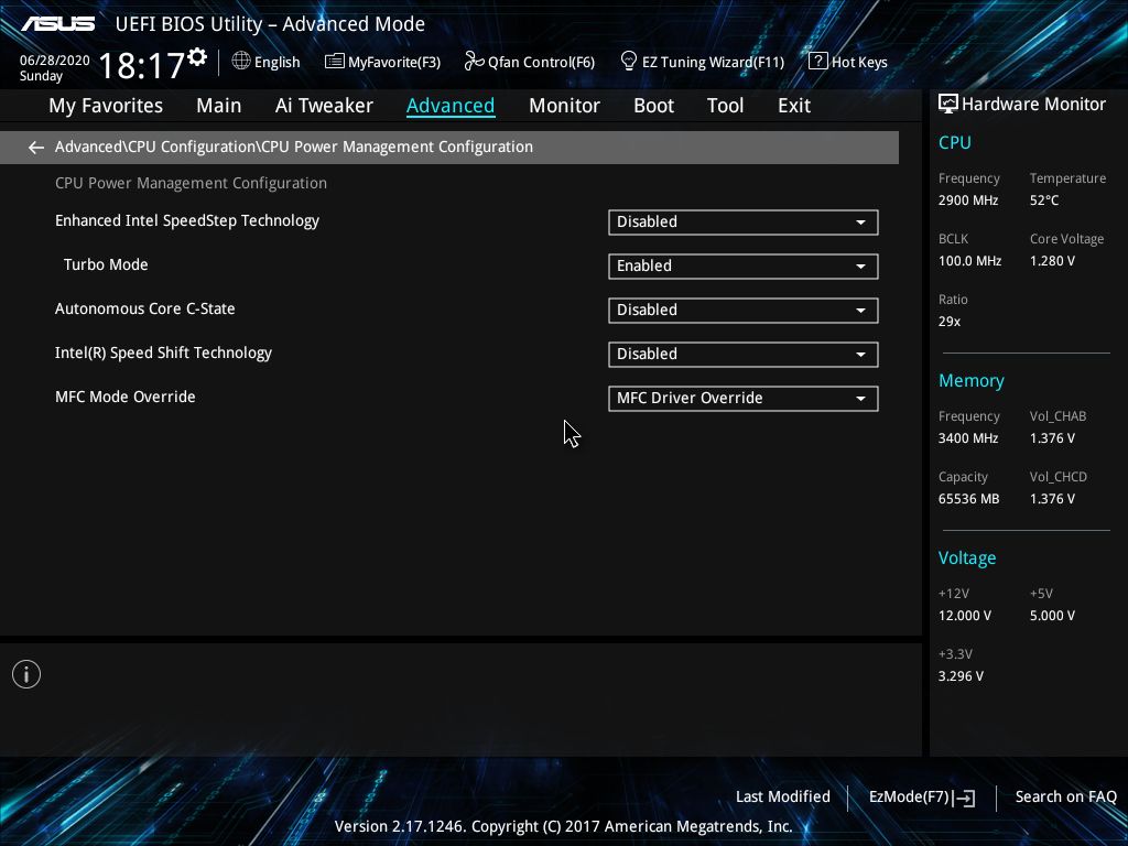 [2020/06/28 18:07:54] Ai Overclock Tuner [Manual] CPU Strap [100] BCLK Frequency [100.0000] ASUS MultiCore Enhancement [Auto] AVX Instruction Core Ratio Negative Offset [5] AVX-512 Instruction Core Ratio Negative Offset [16] CPU Core Ratio [By Specific Core] Min. CPU Cache Ratio [31] Max. CPU Cache Ratio [31] BCLK Frequency : DRAM Frequency Ratio [100:100] DRAM Frequency [DDR4-3400MHz] TPU [Keep Current Settings] CPU SVID Support [Disabled] Extreme Over-voltage [Disabled] BCLK Aware Adaptive Voltage [Enabled] CPU Core Voltage [Auto] CPU Cache Voltage [Auto] Uncore Voltage Offset [Auto] Uncore Voltage Offset Prefix [+] CPU Input Voltage [Auto] DRAM Voltage(CHA, CHB) [1.3800] DRAM Voltage(CHC, CHD) [1.3800] CPU VCCIO Voltage [1.15000] CPU System Agent Voltage [Auto] PCH Core Voltage [Auto] PLL Reference Offset Mode Sign [+] PLL Reference Offset Value [Auto] Turbo Ratio Limit 0 [Auto] Turbo Ratio Cores 0 [Auto] Turbo Ratio Limit 1 [Auto] Turbo Ratio Cores 1 [Auto] Turbo Ratio Limit 2 [Auto] Turbo Ratio Cores 2 [Auto] Turbo Ratio Limit 3 [Auto] Turbo Ratio Cores 3 [Auto] Turbo Ratio Limit 4 [Auto] Turbo Ratio Cores 4 [Auto] Turbo Ratio Limit 5 [Auto] Turbo Ratio Cores 5 [Auto] Turbo Ratio Limit 6 [Auto] Turbo Ratio Cores 6 [Auto] Turbo Ratio Limit 7 [Auto] Turbo Ratio Cores 7 [Auto] *Core-1 Max Ratio [49] CPU Core-1 Voltage [Manual Mode] CPU Core-1 Voltage Override [1.280] Core-2 Max Ratio [49] CPU Core-2 Voltage [Manual Mode] CPU Core-2 Voltage Override [1.280] Core-3 Max Ratio [44] CPU Core-3 Voltage [Manual Mode] CPU Core-3 Voltage Override [1.100] Core-4 Max Ratio [49] CPU Core-4 Voltage [Manual Mode] CPU Core-4 Voltage Override [1.280] Core-5 Max Ratio [44] CPU Core-5 Voltage [Manual Mode] CPU Core-5 Voltage Override [1.100] Core-6 Max Ratio [46] CPU Core-6 Voltage [Manual Mode] CPU Core-6 Voltage Override [1.200] Core-7 Max Ratio [46] CPU Core-7 Voltage [Manual Mode] CPU Core-7 Voltage Override [1.200] Core-8 Max Ratio [45] CPU Core-8 Voltage [Manual Mode] CPU Core-8 Voltage Override [1.140] Core-9 Max Ratio [45] CPU Core-9 Voltage [Manual Mode] CPU Core-9 Voltage Override [1.140] Core-10 Max Ratio [45] CPU Core-10 Voltage [Manual Mode] CPU Core-10 Voltage Override [1.140] Core-11 Max Ratio [47] CPU Core-11 Voltage [Manual Mode] CPU Core-11 Voltage Override [1.230] *Core-12 Max Ratio [48] CPU Core-12 Voltage [Manual Mode] CPU Core-12 Voltage Override [1.270] DRAM CTRL REF Voltage on CHC [Auto] DRAM CTRL REF Voltage on CHD [Auto] DRAM DATA REF Voltage on CHC DIMM0 Rank0 BL0 [Auto] DRAM DATA REF Voltage on CHC DIMM0 Rank0 BL1 [Auto] DRAM DATA REF Voltage on CHC DIMM0 Rank0 BL2 [Auto] DRAM DATA REF Voltage on CHC DIMM0 Rank0 BL3 [Auto] DRAM DATA REF Voltage on CHC DIMM0 Rank0 BL4 [Auto] DRAM DATA REF Voltage on CHC DIMM0 Rank0 BL5 [Auto] DRAM DATA REF Voltage on CHC DIMM0 Rank0 BL6 [Auto] DRAM DATA REF Voltage on CHC DIMM0 Rank0 BL7 [Auto] DRAM DATA REF Voltage on CHC DIMM0 Rank1 BL0 [Auto] DRAM DATA REF Voltage on CHC DIMM0 Rank1 BL1 [Auto] DRAM DATA REF Voltage on CHC DIMM0 Rank1 BL2 [Auto] DRAM DATA REF Voltage on CHC DIMM0 Rank1 BL3 [Auto] DRAM DATA REF Voltage on CHC DIMM0 Rank1 BL4 [Auto] DRAM DATA REF Voltage on CHC DIMM0 Rank1 BL5 [Auto] DRAM DATA REF Voltage on CHC DIMM0 Rank1 BL6 [Auto] DRAM DATA REF Voltage on CHC DIMM0 Rank1 BL7 [Auto] DRAM DATA REF Voltage on CHC DIMM1 Rank0 BL0 [Auto] DRAM DATA REF Voltage on CHC DIMM1 Rank0 BL1 [Auto] DRAM DATA REF Voltage on CHC DIMM1 Rank0 BL2 [Auto] DRAM DATA REF Voltage on CHC DIMM1 Rank0 BL3 [Auto] DRAM DATA REF Voltage on CHC DIMM1 Rank0 BL4 [Auto] DRAM DATA REF Voltage on CHC DIMM1 Rank0 BL5 [Auto] DRAM DATA REF Voltage on CHC DIMM1 Rank0 BL6 [Auto] DRAM DATA REF Voltage on CHC DIMM1 Rank0 BL7 [Auto] DRAM DATA REF Voltage on CHC DIMM1 Rank1 BL0 [Auto] DRAM DATA REF Voltage on CHC DIMM1 Rank1 BL1 [Auto] DRAM DATA REF Voltage on CHC DIMM1 Rank1 BL2 [Auto] DRAM DATA REF Voltage on CHC DIMM1 Rank1 BL3 [Auto] DRAM DATA REF Voltage on CHC DIMM1 Rank1 BL4 [Auto] DRAM DATA REF Voltage on CHC DIMM1 Rank1 BL5 [Auto] DRAM DATA REF Voltage on CHC DIMM1 Rank1 BL6 [Auto] DRAM DATA REF Voltage on CHC DIMM1 Rank1 BL7 [Auto] DRAM DATA REF Voltage on CHD DIMM0 Rank0 BL0 [Auto] DRAM DATA REF Voltage on CHD DIMM0 Rank0 BL1 [Auto] DRAM DATA REF Voltage on CHD DIMM0 Rank0 BL2 [Auto] DRAM DATA REF Voltage on CHD DIMM0 Rank0 BL3 [Auto] DRAM DATA REF Voltage on CHD DIMM0 Rank0 BL4 [Auto] DRAM DATA REF Voltage on CHD DIMM0 Rank0 BL5 [Auto] DRAM DATA REF Voltage on CHD DIMM0 Rank0 BL6 [Auto] DRAM DATA REF Voltage on CHD DIMM0 Rank0 BL7 [Auto] DRAM DATA REF Voltage on CHD DIMM0 Rank1 BL0 [Auto] DRAM DATA REF Voltage on CHD DIMM0 Rank1 BL1 [Auto] DRAM DATA REF Voltage on CHD DIMM0 Rank1 BL2 [Auto] DRAM DATA REF Voltage on CHD DIMM0 Rank1 BL3 [Auto] DRAM DATA REF Voltage on CHD DIMM0 Rank1 BL4 [Auto] DRAM DATA REF Voltage on CHD DIMM0 Rank1 BL5 [Auto] DRAM DATA REF Voltage on CHD DIMM0 Rank1 BL6 [Auto] DRAM DATA REF Voltage on CHD DIMM0 Rank1 BL7 [Auto] DRAM DATA REF Voltage on CHD DIMM1 Rank0 BL0 [Auto] DRAM DATA REF Voltage on CHD DIMM1 Rank0 BL1 [Auto] DRAM DATA REF Voltage on CHD DIMM1 Rank0 BL2 [Auto] DRAM DATA REF Voltage on CHD DIMM1 Rank0 BL3 [Auto] DRAM DATA REF Voltage on CHD DIMM1 Rank0 BL4 [Auto] DRAM DATA REF Voltage on CHD DIMM1 Rank0 BL5 [Auto] DRAM DATA REF Voltage on CHD DIMM1 Rank0 BL6 [Auto] DRAM DATA REF Voltage on CHD DIMM1 Rank0 BL7 [Auto] DRAM DATA REF Voltage on CHD DIMM1 Rank1 BL0 [Auto] DRAM DATA REF Voltage on CHD DIMM1 Rank1 BL1 [Auto] DRAM DATA REF Voltage on CHD DIMM1 Rank1 BL2 [Auto] DRAM DATA REF Voltage on CHD DIMM1 Rank1 BL3 [Auto] DRAM DATA REF Voltage on CHD DIMM1 Rank1 BL4 [Auto] DRAM DATA REF Voltage on CHD DIMM1 Rank1 BL5 [Auto] DRAM DATA REF Voltage on CHD DIMM1 Rank1 BL6 [Auto] DRAM DATA REF Voltage on CHD DIMM1 Rank1 BL7 [Auto] Self-tracked Clocking [Auto] PCIe Gen3 PLL Clock Control [Enabled] PLL Post Divider Adjust [Auto] Change PLLTRIM Prefix [+] Change PllTrim Value [Auto] Change MC-PLLTRIM Prefix [+] Change MC-PllTri