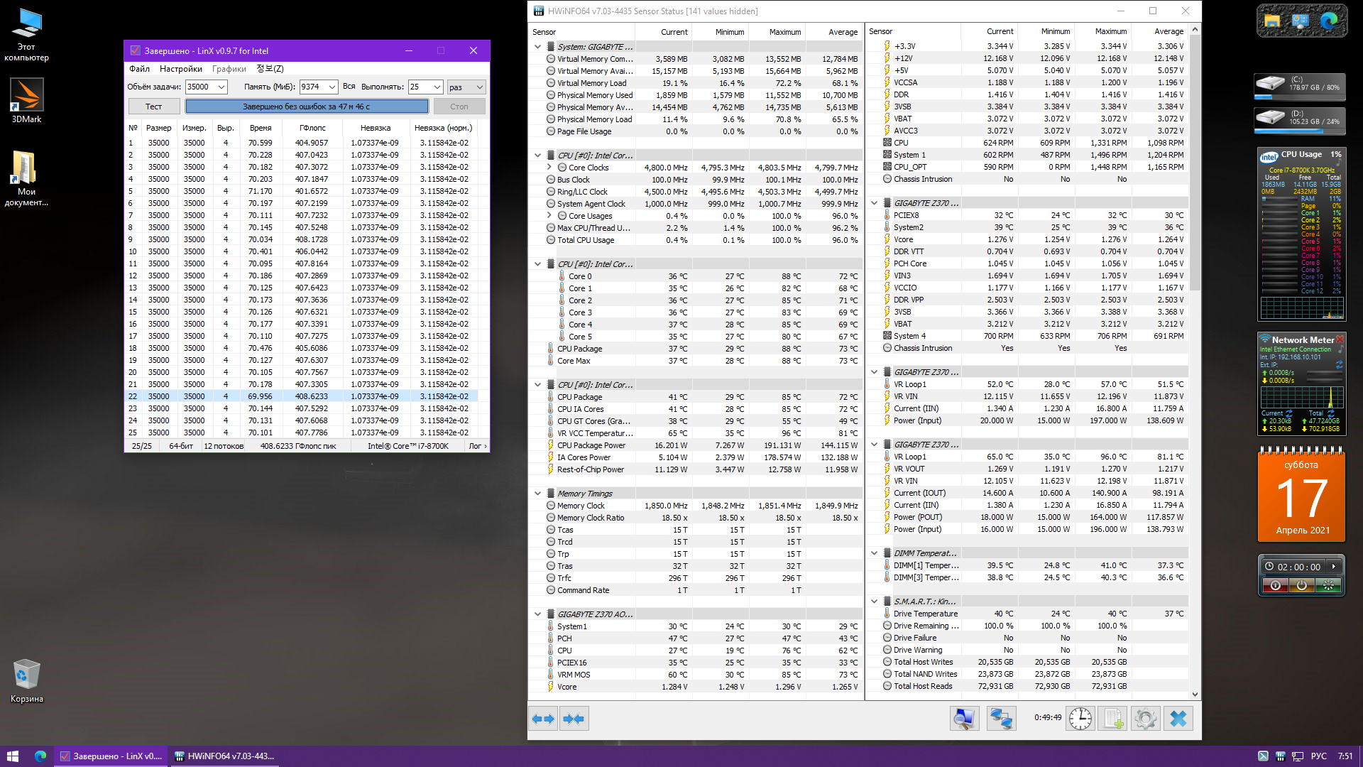Полученный результат должен иметь следующий вид: Скриншот рабочего стола после прохождения >9 циклов (т.е. между 9 и 10 проходами). Вместе с LinX на рабочем столе должны быть развернуты CPU-Z (первая вкладка) и Core Temp, это обязательный минимум. Такой набор программ даст информацию о напряжении и температурах под нагрузкой-простоем. По желанию можете добавить другие программы, показывающие дополнительную информацию о вашей системе, например третью вкладку CPU-Z, которая покажет модель материнской платы и версию BIOS. Пример результата разгона: Mad Max, 5100 МГц (AVX 0), i7-8086K, HT-ON, Cache 4700, Vcore=1.36V, Batch L805E123, Gigabyte Z370 Aorus Gaming 7 (bios F6), Be Quiet! Dark Rock Pro 4, ЖМ под HS, Windows 10 Pro 64-bit 1809, LinX 0.9.3 64bit.