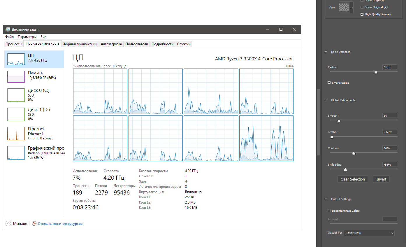 Если ты занимаешься обработкой фото то должен знать что в режим select and mask грузит все ядра под 100% на всем протяжении. Режим content aware fill тоже самое. На перегоне 500 фоток из raw в png - 4 ядерные огрызки трагически умирают.