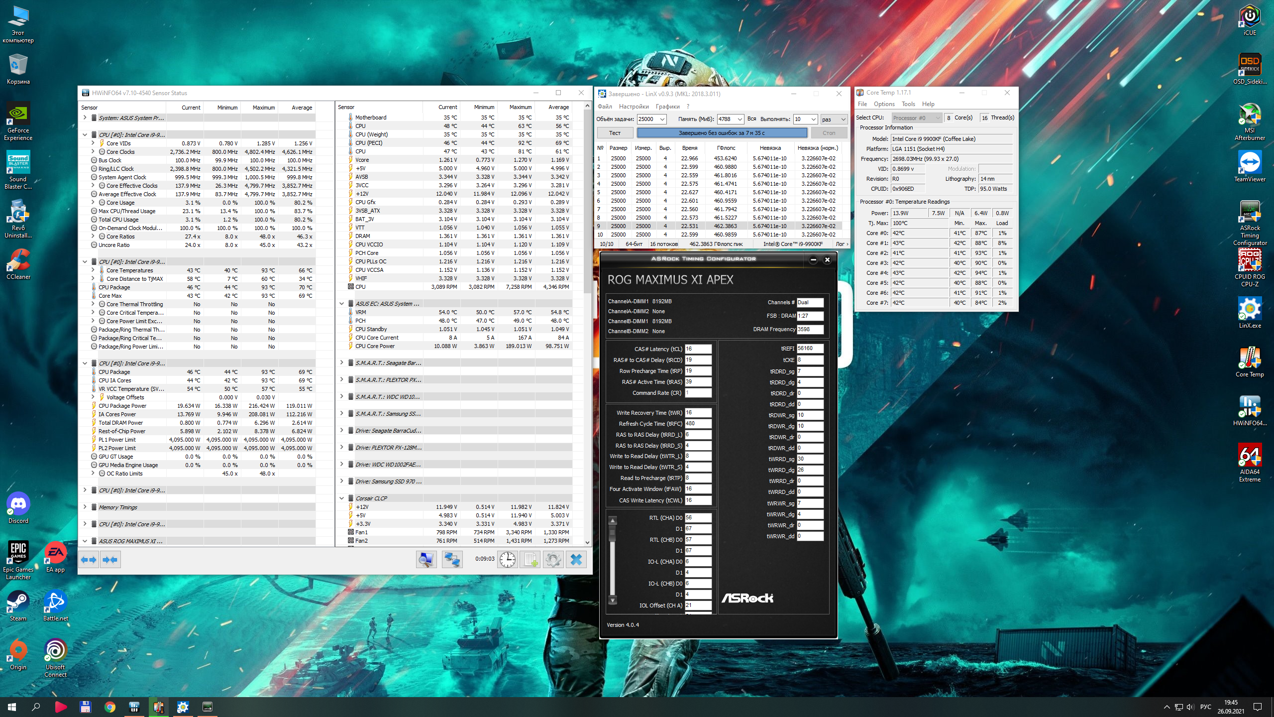 ЗЫ: Погонял 9900KF. Вот к слову, температура в MW2019 - 70-71 максимум, это пока вот в таком, лёгком разгоне. Выжать максимум не старался, недовода корсар не позволит. Так потестил слегонца. 4800Мгц, в LinX напряжение vid 1.285, vcore практически на всём периоде теста 1.17-1.19в. С просадками до 1.13. Изредка прыгая до 1.2в. Да, разгон через adaptive mode. 1.25в +offset 0.03в. Память конечно мусор, но исходим из того, что имеем.