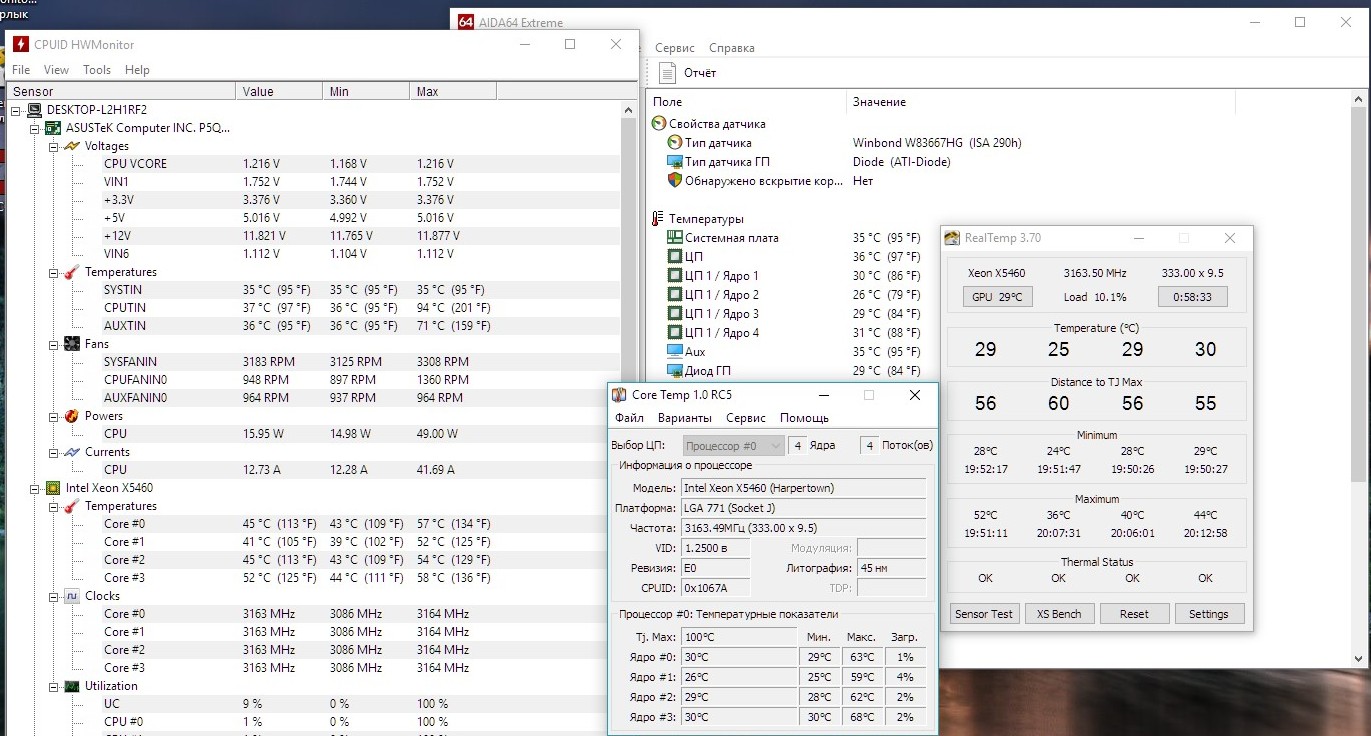rvarva Tcc или TjMax - это точка отсчета температуры у любого Intel процессора. Термодатчики ядер показывают, сколько еще градусов осталось до этой температуры. RealTemp именно так и пишет - Distance to TJ Max Современные процессоры позволяют также прочитать и само значение TjMax, но обсуждаемые Xeon'ы это не умеют. Приходится пользоваться "табличными" значениями. Исправьте в hwmonitorw.ini CPU_0_TJMAX=85.0