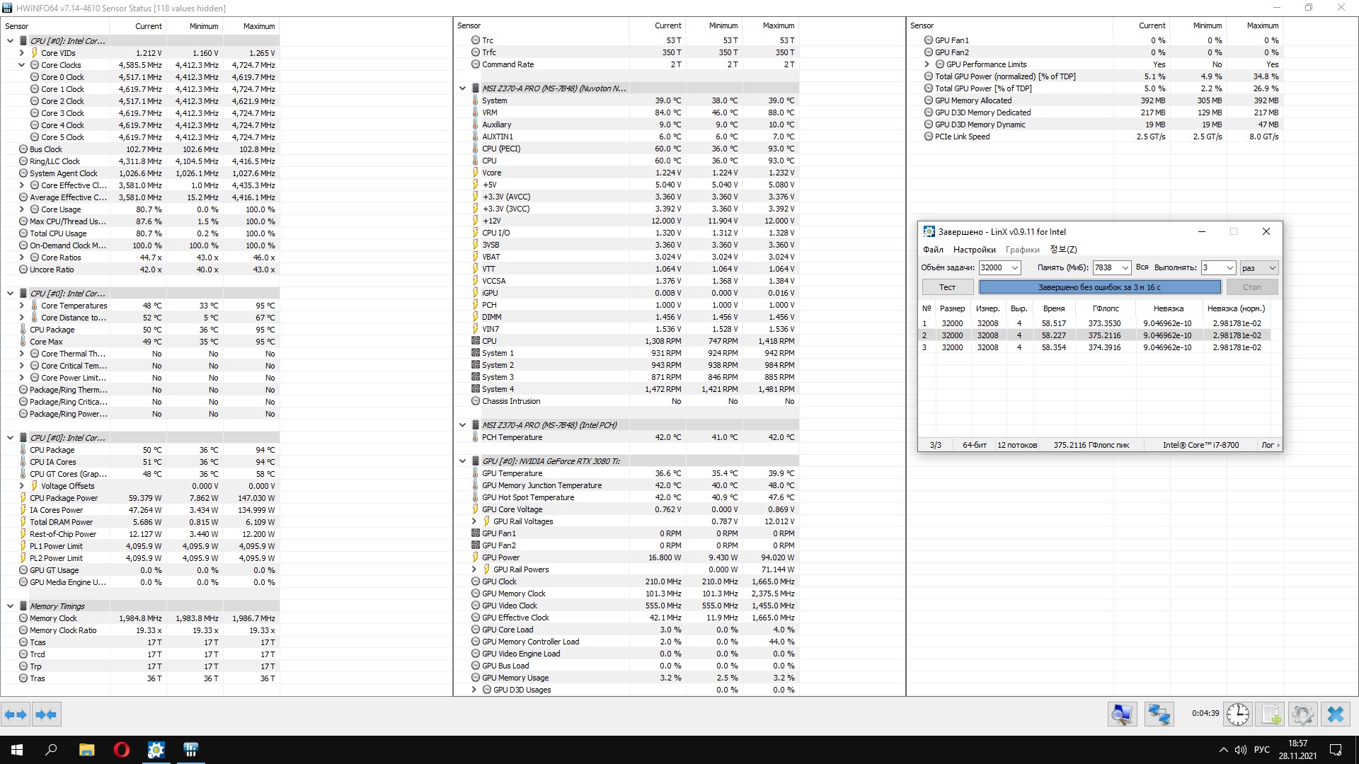 Полученный результат должен иметь следующий вид: Скриншот рабочего стола после прохождения >9 циклов (т.е. между 9 и 10 проходами). Вместе с LinX на рабочем столе должны быть развернуты CPU-Z (первая вкладка) и Core Temp, это обязательный минимум. Такой набор программ даст информацию о напряжении и температурах под нагрузкой-простоем. По желанию можете добавить другие программы, показывающие дополнительную информацию о вашей системе, например третью вкладку CPU-Z, которая покажет модель материнской платы и версию BIOS. Пример результата разгона: Mad Max, 5100 МГц (AVX 0), i7-8086K, HT-ON, Cache 4700, Vcore=1.36V, Batch L805E123, Gigabyte Z370 Aorus Gaming 7 (bios F6), Be Quiet! Dark Rock Pro 4, ЖМ под HS, Windows 10 Pro 64-bit 1809, LinX 0.9.3 64bit.