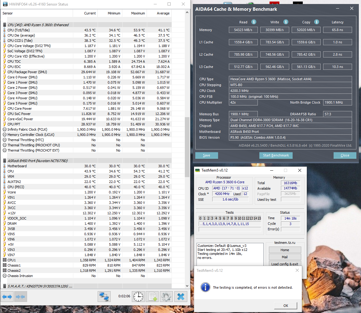 Asrock B450 pro 4 R5 3600 BL8G30C15U4W 2x8 (не KIT, а OEM плашки) Сначала то что выставлено в BIOS, затем в (скобках) что показывает HW info под нагрузкой: CPU Voltage 1.2v (1.150v), 4200 Ghz, FIX SOC 1.1v (1.087v) Memory 3800 mhz, FCLK 1900, 1.350v (1.368) VDDG CCD Voltage 0.950 VDDG IOD Voltage 0.950 VDDP Voltage 0.950
