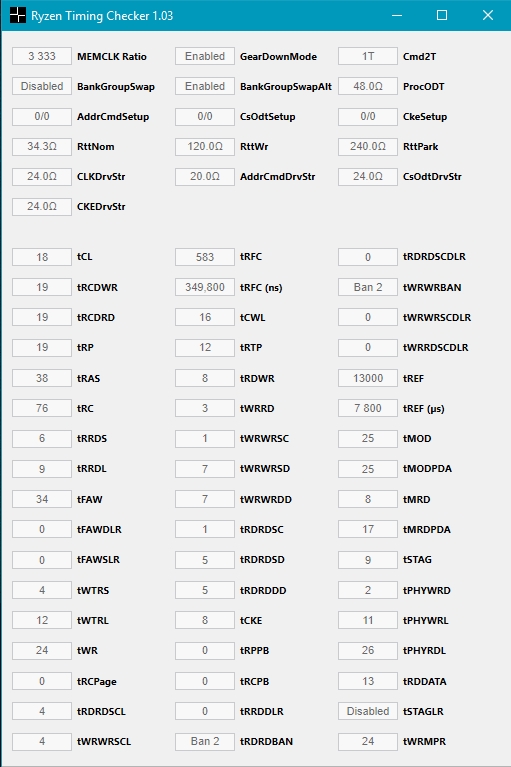 1usmus Да. Сейчас запустил с проком 48ом на 3466мгц и rtt off/off/5 (cad bus в авто) в rtc1.03 кажет теже rtt что и для 3333 с авто, т.е похоже он не умеет считывать эти данные (просто предположение)