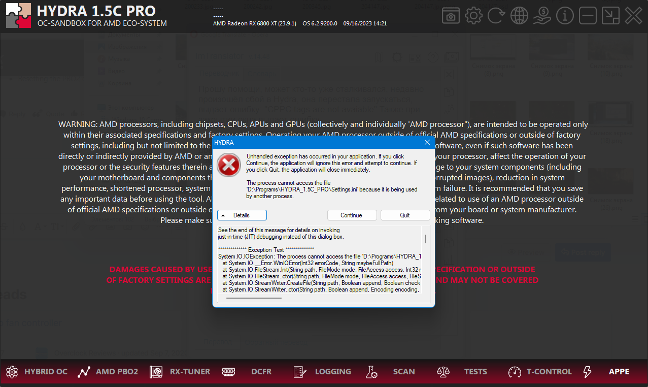 Доброго дня форумчане! Решил поискать совета здесь, так как, нигде ничего не нашёл, в общем, пользуюсь программой Hydra, всё было хорошо, но недавно появилась ошибка, к сожалению, что к ней привело не могу объяснить, единственное что я перед этим сделал, это попытался отключить в биос SmartFan, т.к. пользуюсь FanControl. После этого Hydra перестала нормально запускаться выдает ошибку: