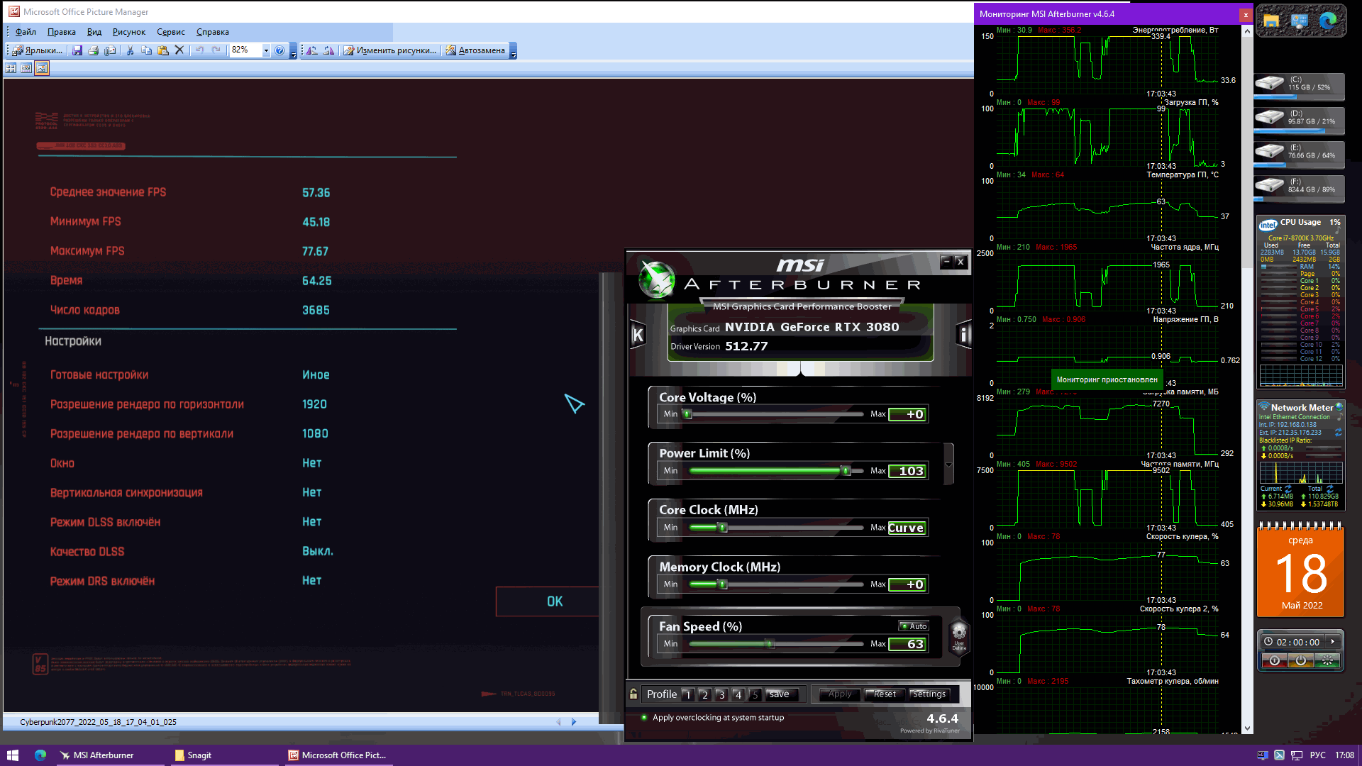 Вот именно что не точно, оно ещё и память имеет значение которая у меня довольно шустрая. Вот панк, встроенный бенч, с максимальными настройками руками и с выключенным DLSS, как видно из скринов ядер и производительности ему хватает для 3080 12Гб карты и FHD разрешении.