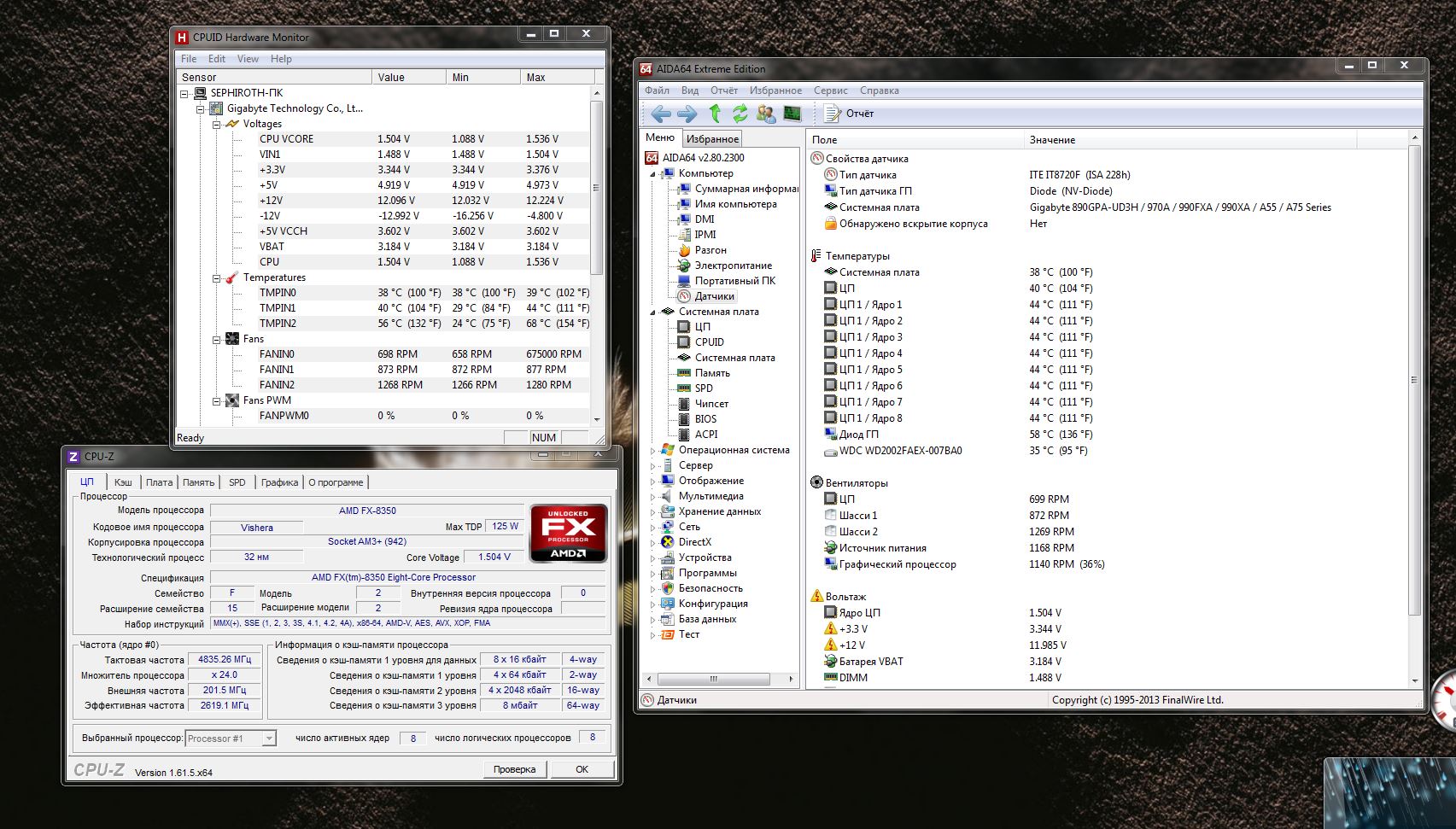 Материнка ASUS M5A99X EVO, фаз вроде там достаточно. Недавно понижал напругу на 4.6Ггц, стояло вроде 1.5+, сполз до 1.500В по тестам и завис. Сделал один раз +, но винда ребутилась, потом ещё раз +, опять ребуты, и ещё пару раз плюсанул напругу, в итоге вернул напругу на исходную 1.5+ (не помню точно сколько).