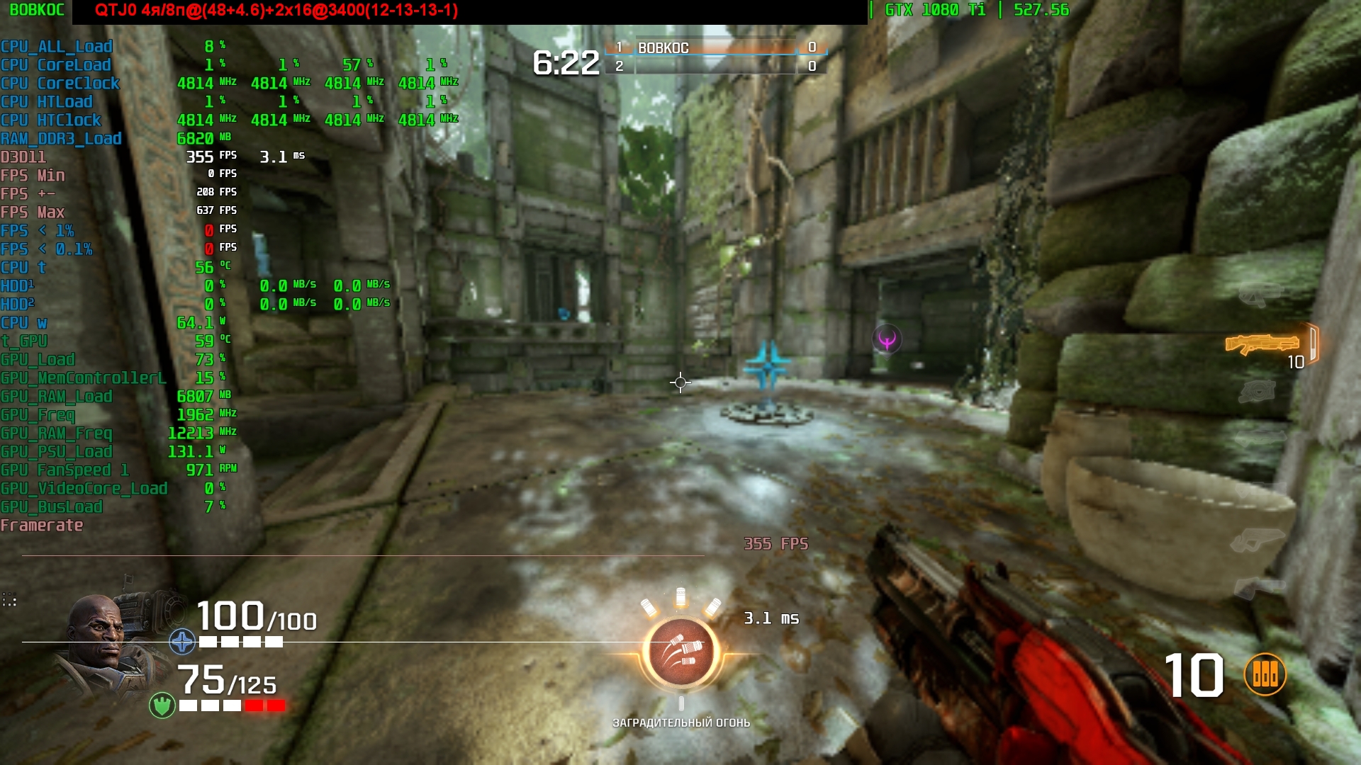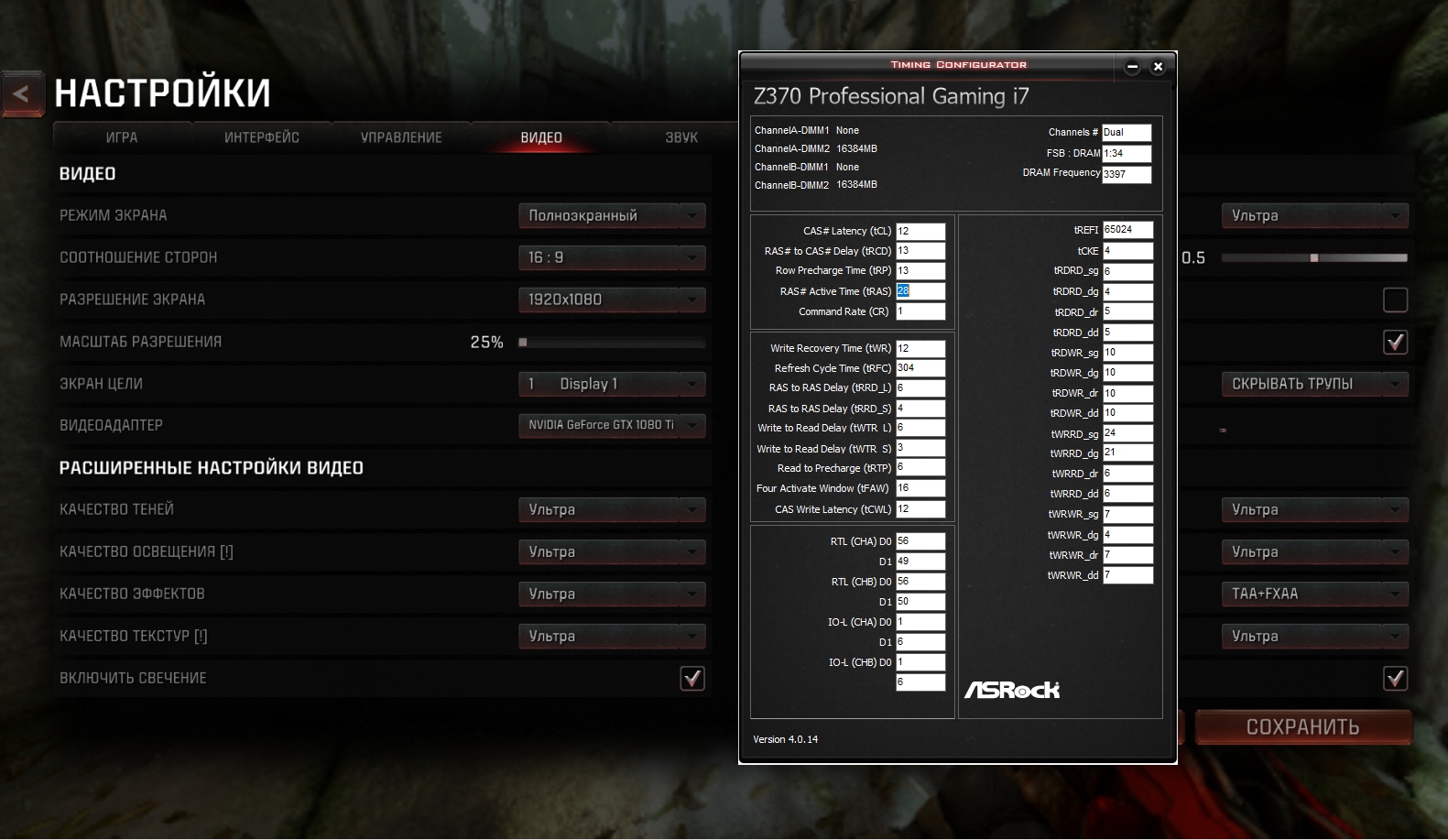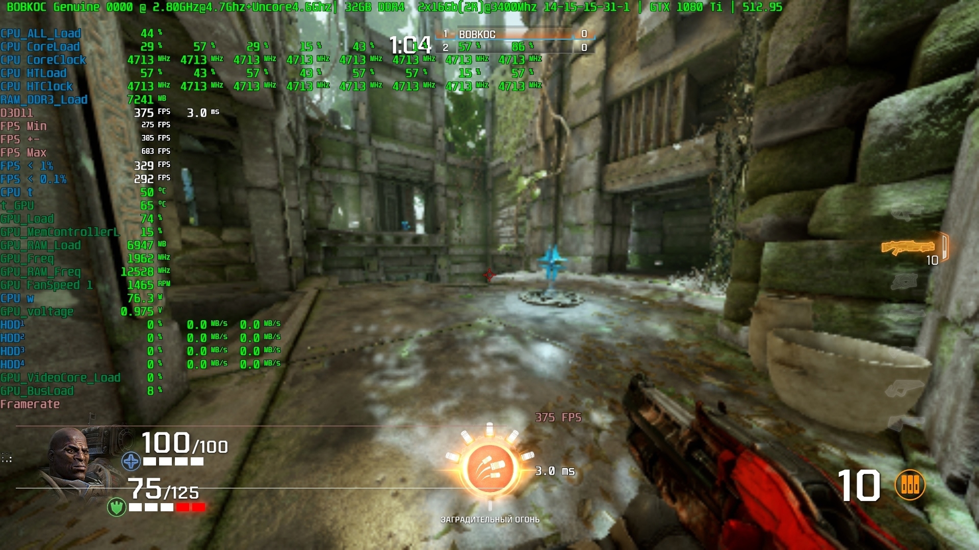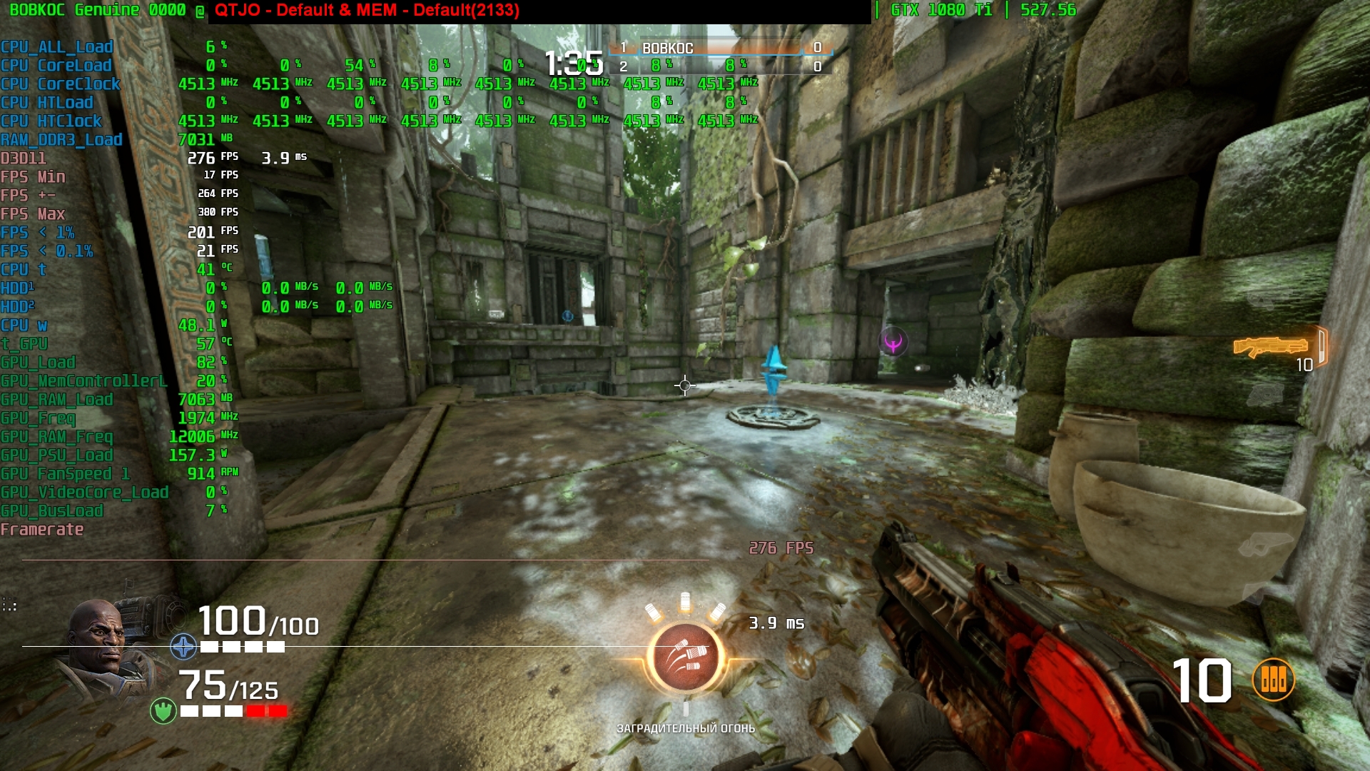 всё просто, выставляешь разрешение 1280х720 и глядишь загрузку видюхи и если надо снижаешь рендер или в обратном порядке. для примера; 1/ QTJ0@(4.7+4.6)+2х16@3400 1920Х1080 25% масштаб разрешения +1080ti