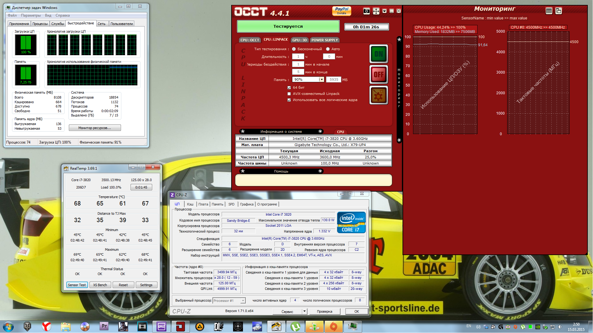 Собственно, думал что 3820 не разгоняем, так как множитель заблокирован, но посмотрев пару обзоров узнал, что хитрым способом, увеличивая host clock и играясь с множителем можно немного прогнать этот проц. Железо профильное, с памятью не мудрил, лишь выставлял частоты близкие к номиналу в 1600мгц, порой в меньшую сторону. Настройки вольтажей и таймингов не производил, трогал только вольтаж ЦП. Turbo boost отключил, остальное включено. И так, что вышло: Пробовал выставить host 124.99, при вольтаже ЦП 1.38 и 1.395, множитель 37, система не стартанула. Пробовал 1.375, хост 125 и множитель 37, тест линпака проходит секунд 15, потом ошибка по ядру... Поставил 117 и множитель 39 и 40, вольтажы те-же, 1.380-1.395, не помогло, система не запустилась. Пока что получилось стартануть и провести тест в OCCT linpack при следующих настройках - host 104.7, множитель х43, вольтаж 1.35в, память на 1666мгц.