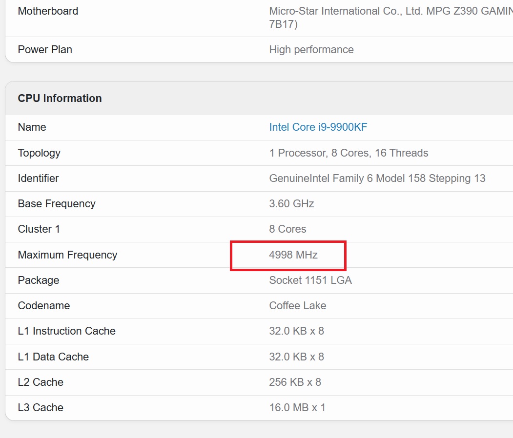 я думаю что гигбенч софтина написана так что если видит проц 9900K то выдает значение частоты не реальное а то что указано в пасспорте, а в пасспорте на сайте интел и в самом биосе указано 5000mhz, просто не указано что только 1 ядро.
