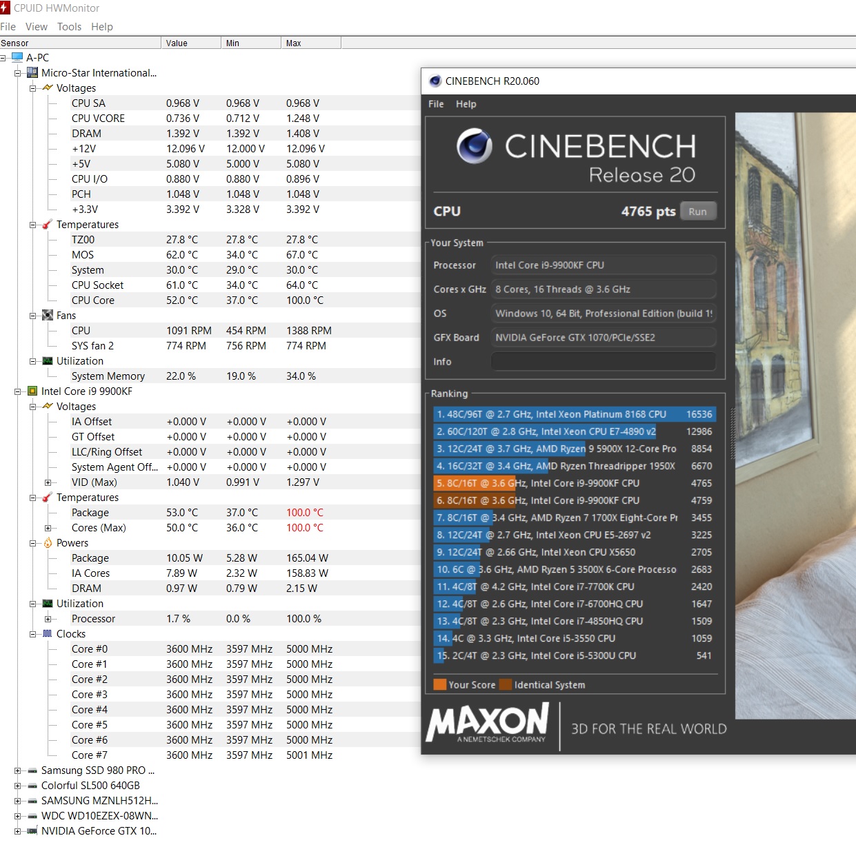 поставил 4800mhz 1.25V, результат чуть лучше но все равно меньше чем у тебя, а температура на 19С меньше, 2 раза прогнал.