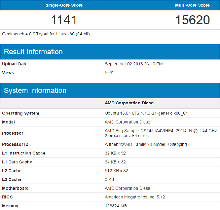 Учитывая что во многопотоке у тебя лишь в 4 раза результат больше, чем в однопотоке и это при 8 ядрах, склонен предположить что у бенча нагрузка на ФПУ как и у линпака. Иными словами он грузит не ядро, а целый модуль. От того и лишь 4-ех кратный прирост, а не 7-8 как бы должно было быть на самом деле. Так что это не совсем тот однопоток, который на зен или и5/и7. В любом случае амд сама говорила, что серверная платформа выйдет летом только, не вижу смысла ориентироваться на ее сырые результаты с низкими частотами. Нужно ждать слива именно настольных инженерных процов, кстати почему-то тишина по производительности будущих АПУ на АМ4, а ведь выходят то они уже скоро.