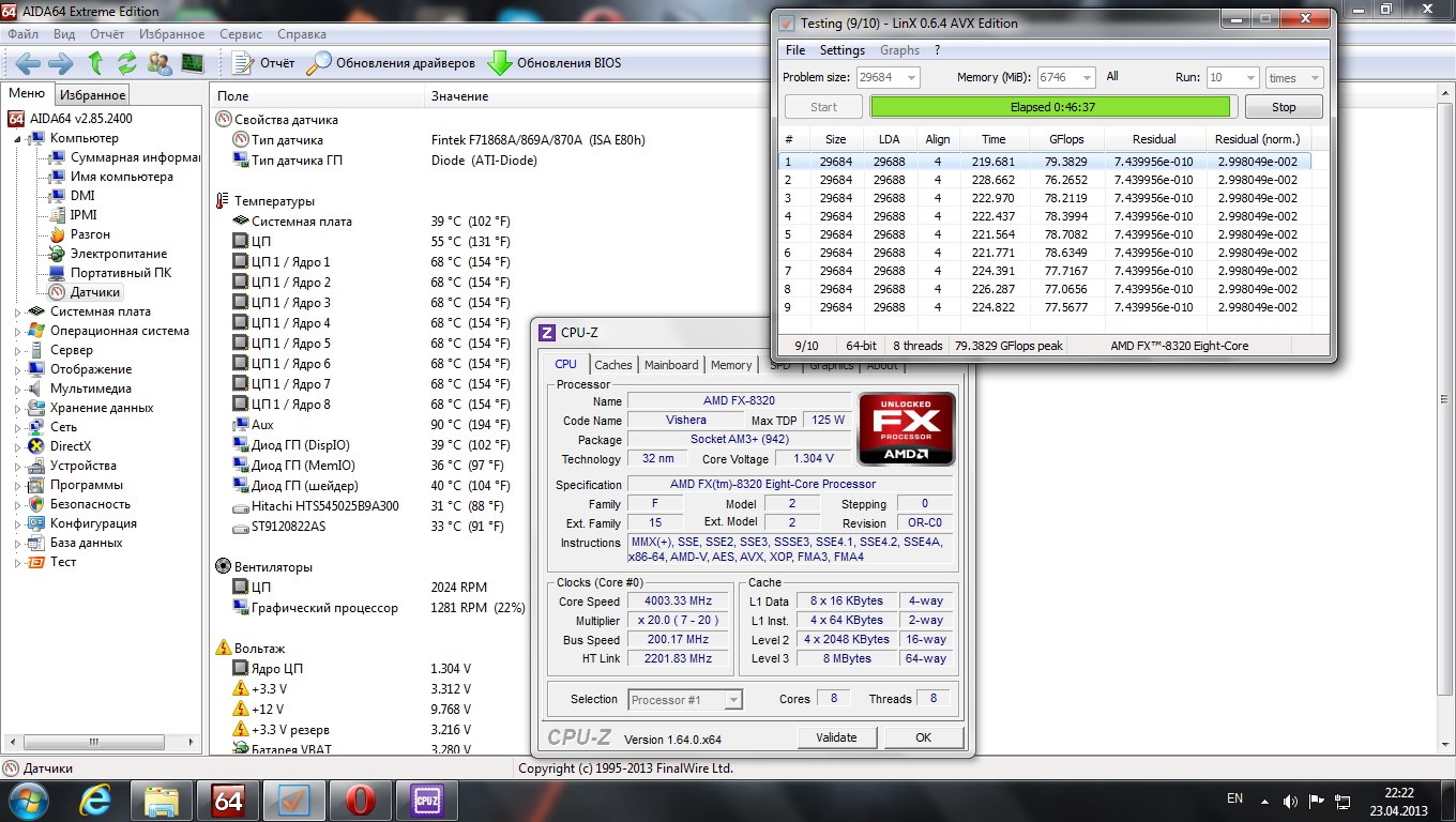 cannibal_pro Та не, там все одинаково получается если комп не трогать.. Я просто начинаю что-нибудь делать, ибо втыкать по полчаса в работающий линпак надоедает быстро..