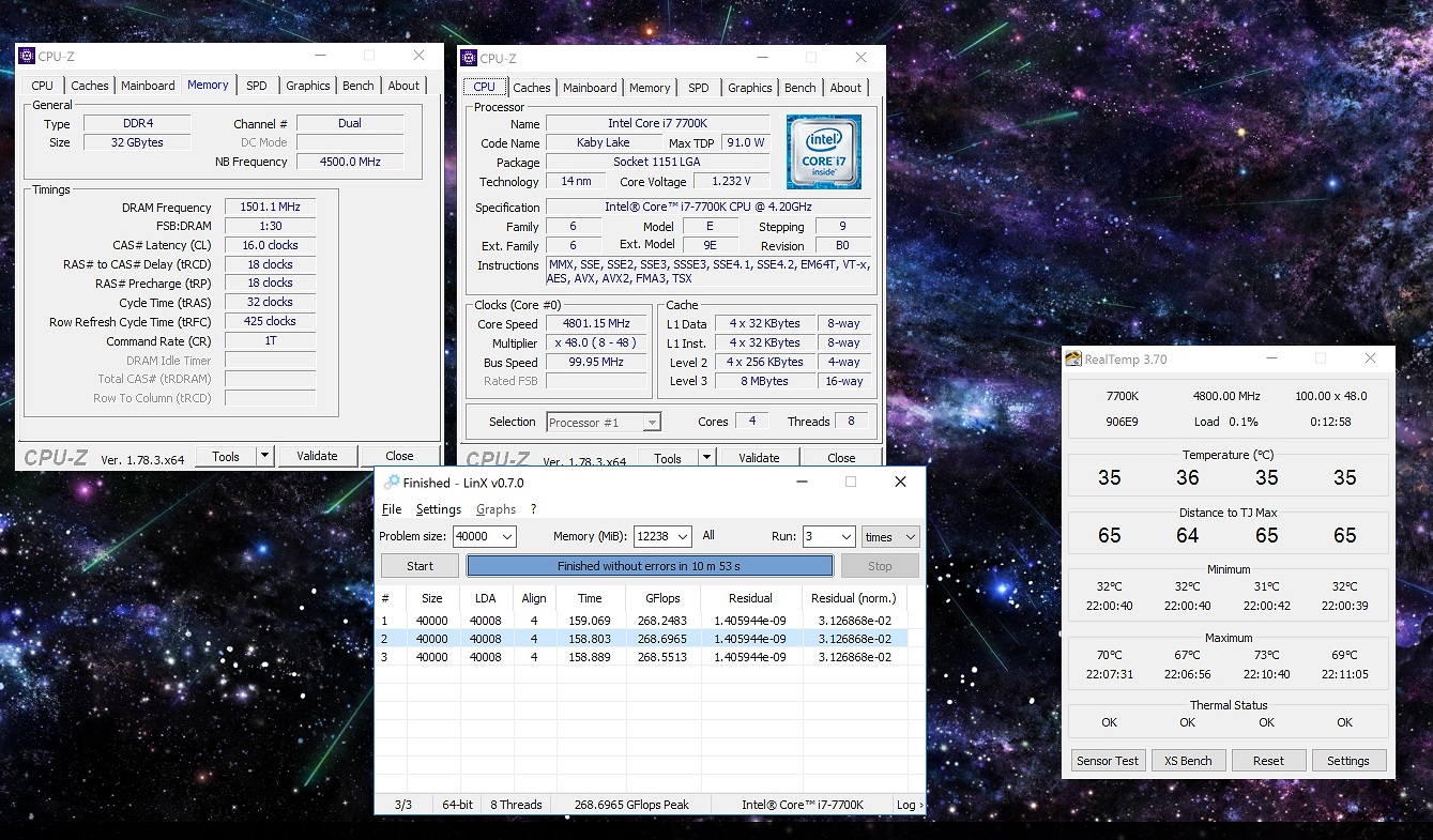 Хочу поблагодарить Atheros за быстрый и качественный скальп. Проц мне достался не очень - для 4.8 ГГц надо 1.3 В . До скальпа самое горячее ядро было на 8° жарче остальных и прогревалось до 99°, после скальпа 72° и разброс по ядрам 3-4°. Для достижения 5 ГГц процессору нужно более 1.4 В при температуре более 80°, поэтому решил остановиться на 4.8. При частоте кэша более 4.5 ГГц виснет наглухо комп, какое напряжение крутить для кэша?