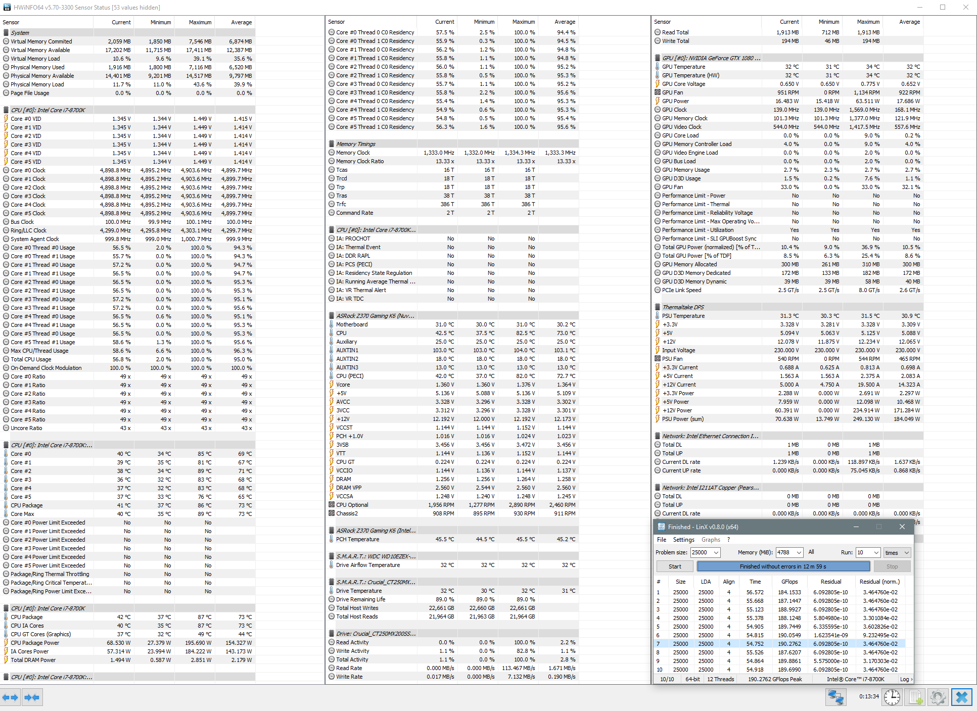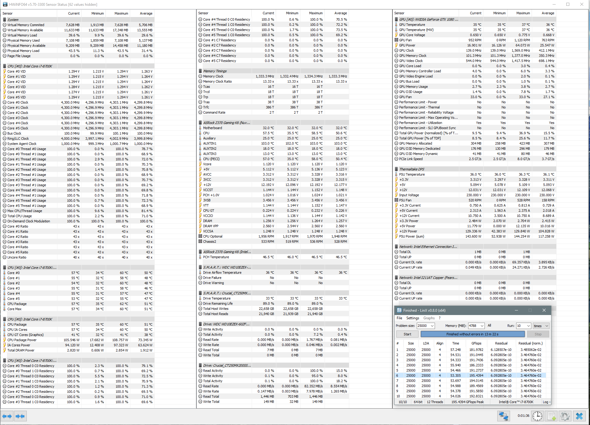 Полученный результат должен иметь следующий вид: Скриншот рабочего стола после прохождения >9 циклов (т.е. между 9 и 10 проходами). Вместе с LinX на рабочем столе должны быть развернуты CPU-Z (первая вкладка) и Core Temp, это обязательный минимум. Такой набор программ даст информацию о напряжении и температурах под нагрузкой-простоем. По желанию можете добавить другие программы, показывающие дополнительную информацию о вашей системе, например третью вкладку CPU-Z, которая покажет модель материнской платы и версию BIOS. Пример результата разгона: Mad Max, 5100 МГц (AVX 0), i7-8086K, HT-ON, Cache 4700, Vcore=1.36V, Batch L805E123, Gigabyte Z370 Aorus Gaming 7 (bios F6), Be Quiet! Dark Rock Pro 4, ЖМ под HS, Windows 10 Pro 64-bit 1809, LinX 0.9.3 64bit.