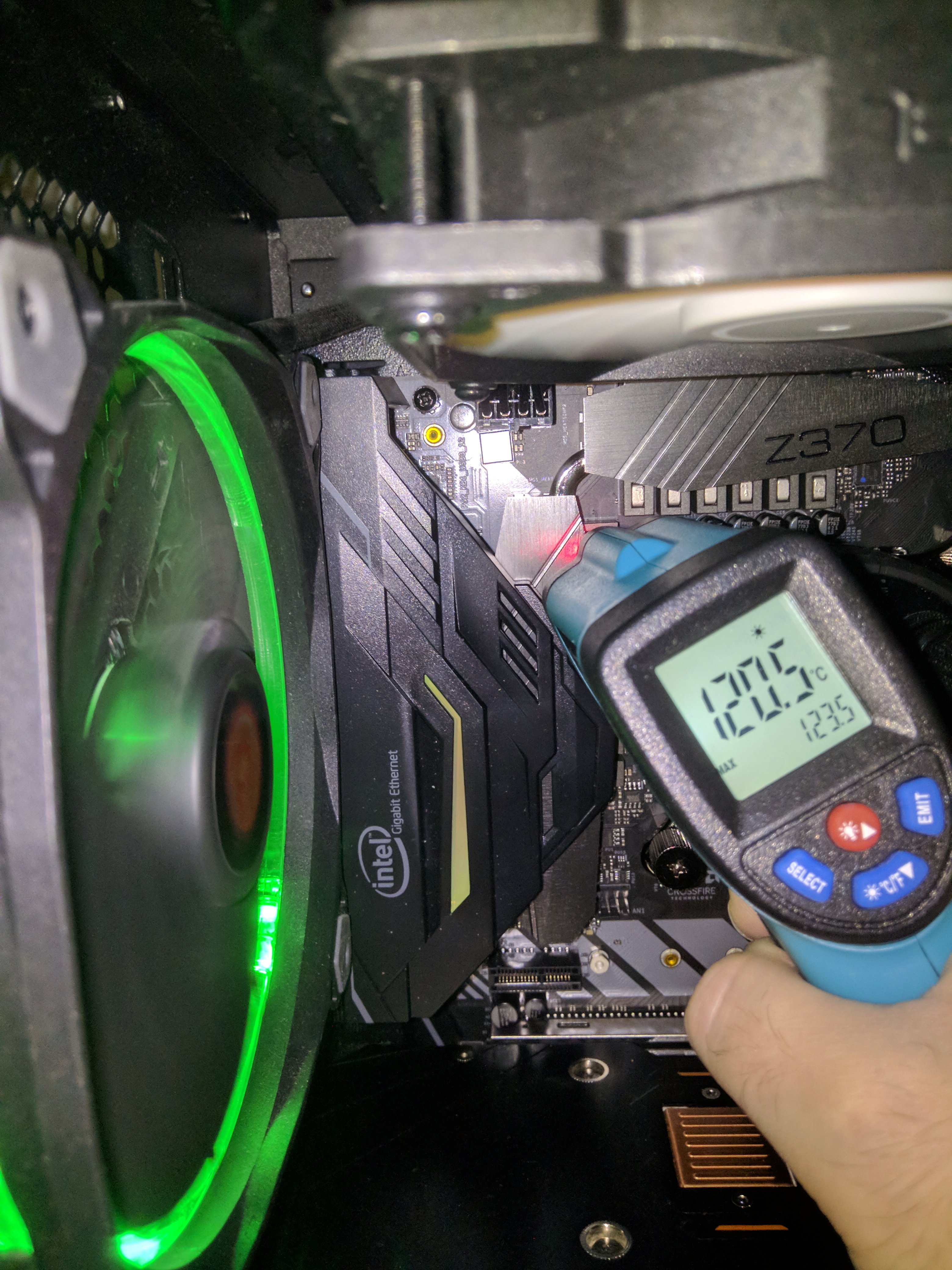 В итоге, практически на том же вольтаже получил прибавку +200mhz по сравнению с Pro4, но по сравнению с той же Pro4 тут температура VRM не меньше в разгоне и где-то даже больше. При разгоне на 4,9 с вольтажом 1,4 жарило до 123 градусов [на 1,37v 115 гр]