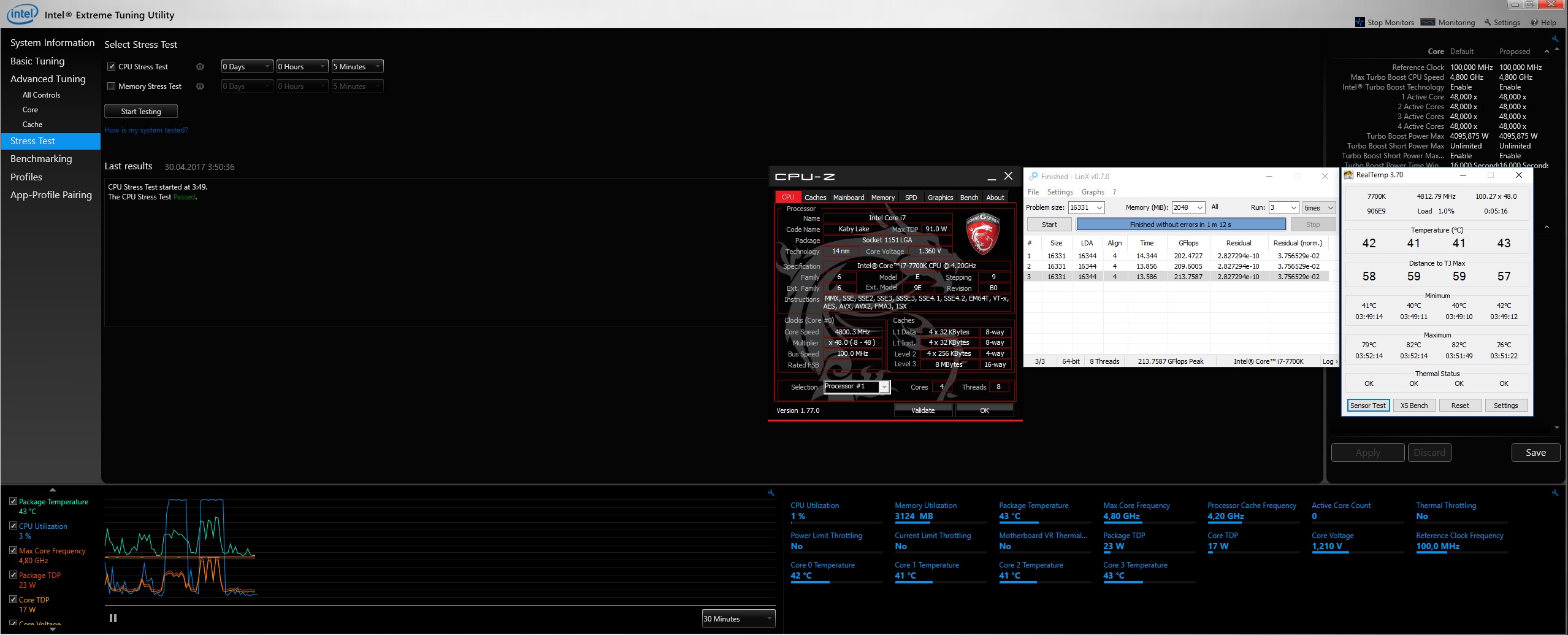 Я тут обнаружил, что 10-кратный прогон 1507mb задачи в Linx ("местный эталон") - не выявляет должным образом стабильность системы. При разгоне 7700k до 4,9 на постоянку - при напряжении 1,385 - тест проходился успешно всегда, но игры и проги периодически вылетали. Хороший вариант предложен в руководстве из ветки Haswell - 30 прогонов 6144mb задачи. В итоге для прохождения 40-минутной жарки камня - пришлось поднять напряжение до 1,400 (Adaptive). Тест был пройден успешно, и какие либо глюки пропали.