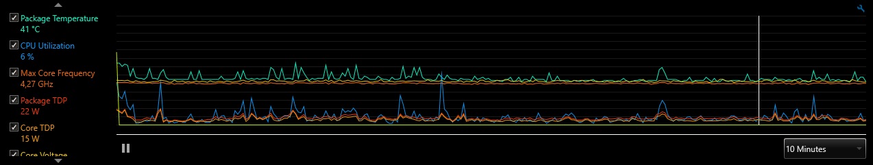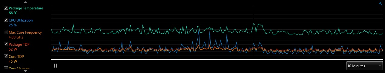 да как раз жм намазан норм, до момента когда я применил в биосе рекомендуемые от комрада выше настройки, в стоке скачки были небольшие, а тут прям стало как до скальпа примерно там где выделил курсором на телеметрии - отключил оперу и стим, и стало чуточку меньше бросать, но странно это, неужели опера так влияет... грешу еще на БП (Zalman ZM-600LX), но он вроде нормальный... может винду еще переустановить, давно ставил