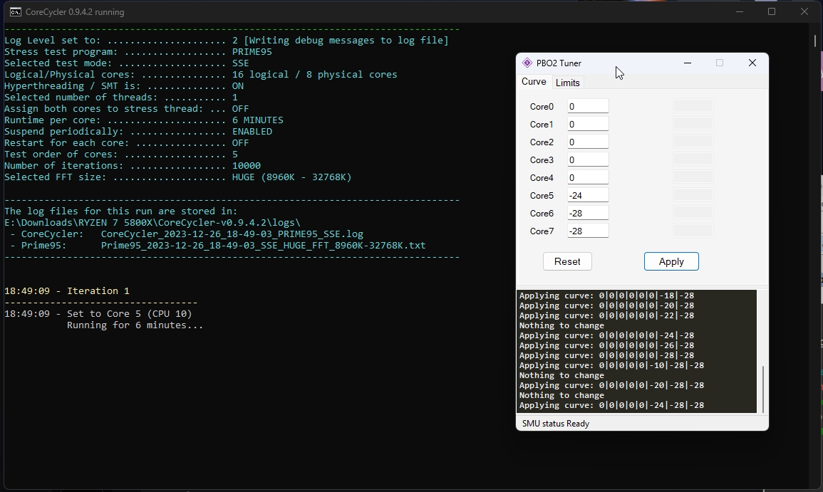 Лично я выставил сразу лимиты по максимуму что может VRM материнки и сколько может переварить охлаждение. Precision Boost Overdrive Scalar чем больше значение, тем позже и менее агрессивно процессор сбрасывает частоты после того как пропала нагрузка. Выставил на максимум. Что касается Load-Line Calibration то для всего кроме VCore выставляю в самое агрессивные значения, хотя и для VCore тоже. Precision Boost берёт во внимание показания именно мониторинга, а не запрашиваемое значение. Мониторинг материнской платы читается Precision Boost`ом через такой протокол как SVI2 TFN. Технология заключается в следующем: 1)выставляем Желаемый VCore Offset, если выставляем его в сторону увеличения, то малопоточная производительность будет выше, если в сторону уменьшения то многопоточная производительность будет выше. Под каждую настройку VCore Offset надо подправлять значения Curve Optimizer, 2)сначала для всех ядер уменьшаем Curve Optimizer, 3)запускаем скрипт, упомянутый выше, повторяем шаг номер 2, пока ни начнёт вываливаться ошибка на одном или нескольких ядрах и откатываемся на один шаг 4)запускаем после этого Cinebench R20, с большой вероятностью система просто перезагрузится, это по большей части лечится добавлением CPU PLL напряжения с 1,8V, но не превышая 1,9V, хотя от чрезмерного напряжения PLL может начаться обратный эффект и стабильность пропадёт, 5)далее начинаем настраивать Curve Optimizer для каждого ядра отдельно и проверяем стабильность как в шагах 3-4.