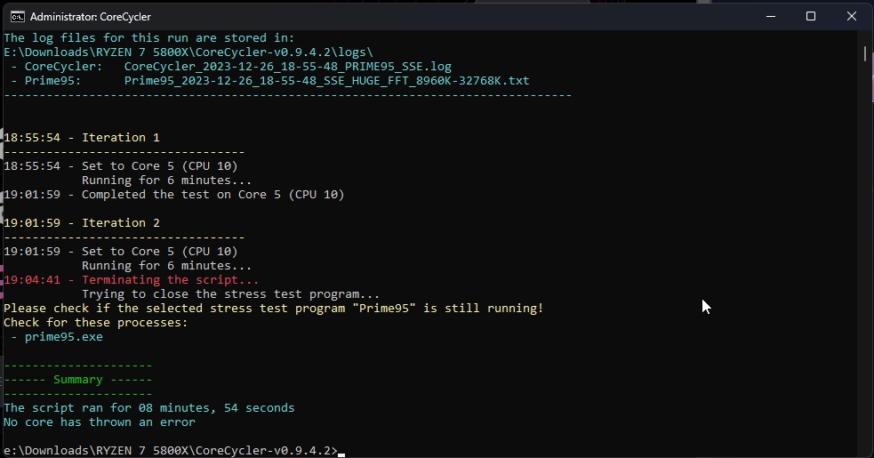 Тестирую CoreCycler-ом поядерно все как положено, настройки в BIOS как писал vol2008 дефолт + PBO PBO limits - motherboard Вoost override - 0-100 (выбрать такое значение, чтоб в CBR23 частоты не упирались в потолок) я поставил 100 CO - disabled Vcore/CPU LLC - auto Делаю по 1-2-3 итерации по 6 минут, затем CTRL-С terminate сессию, пишет "No core has thrown an error"
