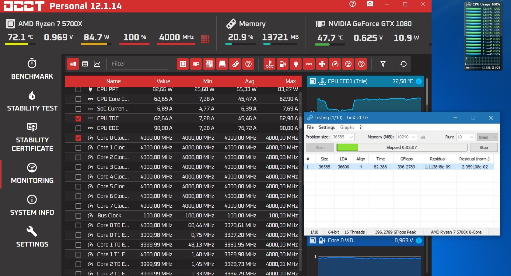 npa4ka может конечно тут еще играет роль момент что винду я заново не накатывал когда проц сменил, но мне лень. все стабильно работает. раньше на 3600 я не мог стабилизировать 1800, щас я не могу и расшатать хоть до каких-то ошибок и т.п., вернее я попробовал vddg 800 825 и только тогда поперли невязки в LinX с небольшой просадкой гфлопс, при этом Gemm выдал те же 250 и все это без WHEA. крутанул обратно напруги до 900 925 итого 20 прогонов LinX 8192 без невязок и с небольшой просадкой только относительно первого прогона (нагрелось), все остальные прогоны +-1гфлопс. Gemm те же 250. конечно смущает что тут иногда может выдать 270-230, но да пофиг уж че уж) UPD: на всякий случай прогнал без PBO и CO, три прогона - 218, 227, 258 еще раз попробую, но еще память давану на 2133