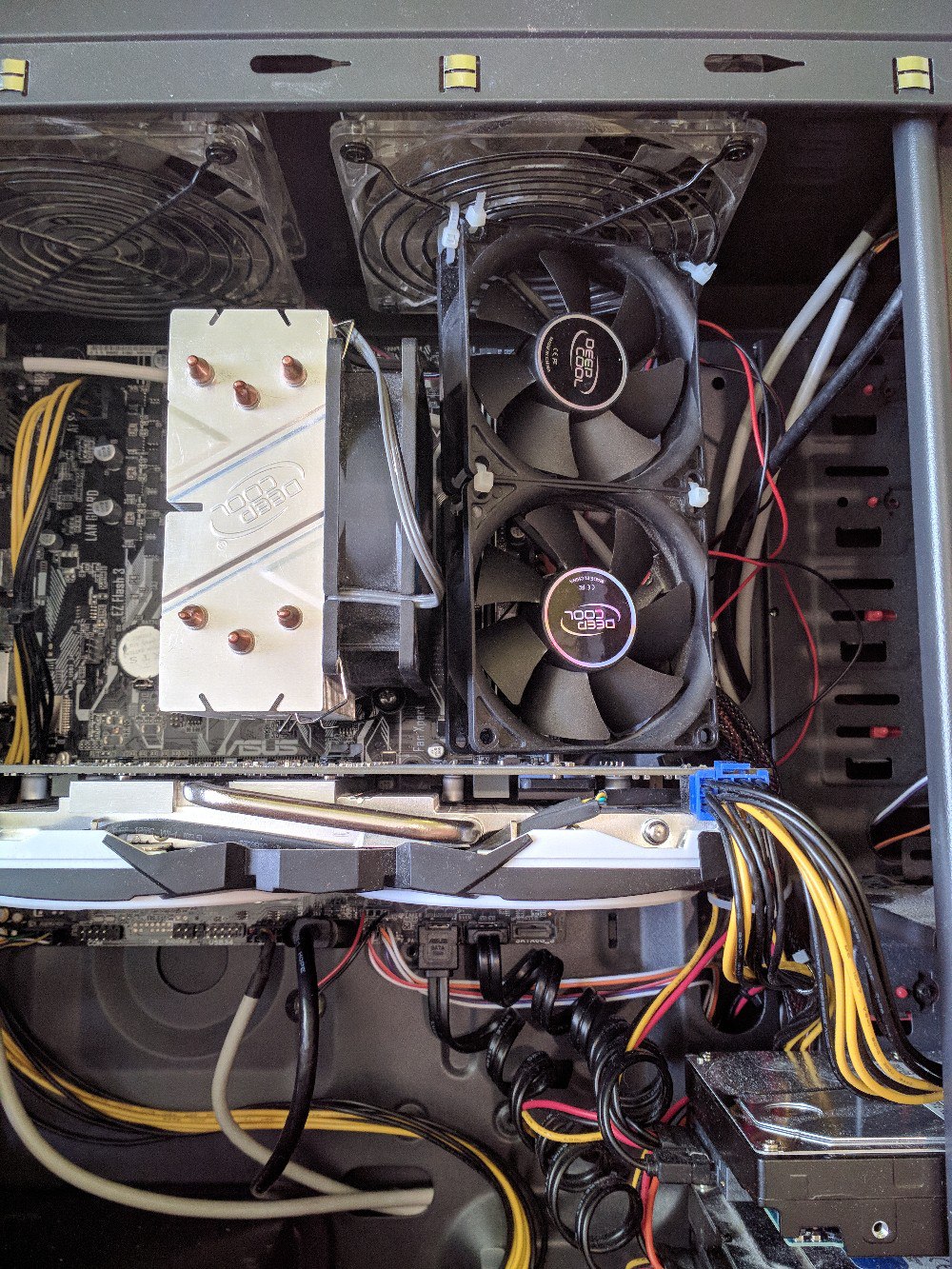 1. Главное, чтобы в корпус заходил поток не меньше, чем выдув. Поищи инфу по своим кулерам на вдув/выдув и посчитай. Ни в коем случае нельзя создавать разреженность воздуха в корпусе. 2. Я тут у себя прикидывал и так и эдак. Не стал ставить 2й вентилятор на выдув, который над озу. Посчитал, что он мешает правильному потоку воздуха.