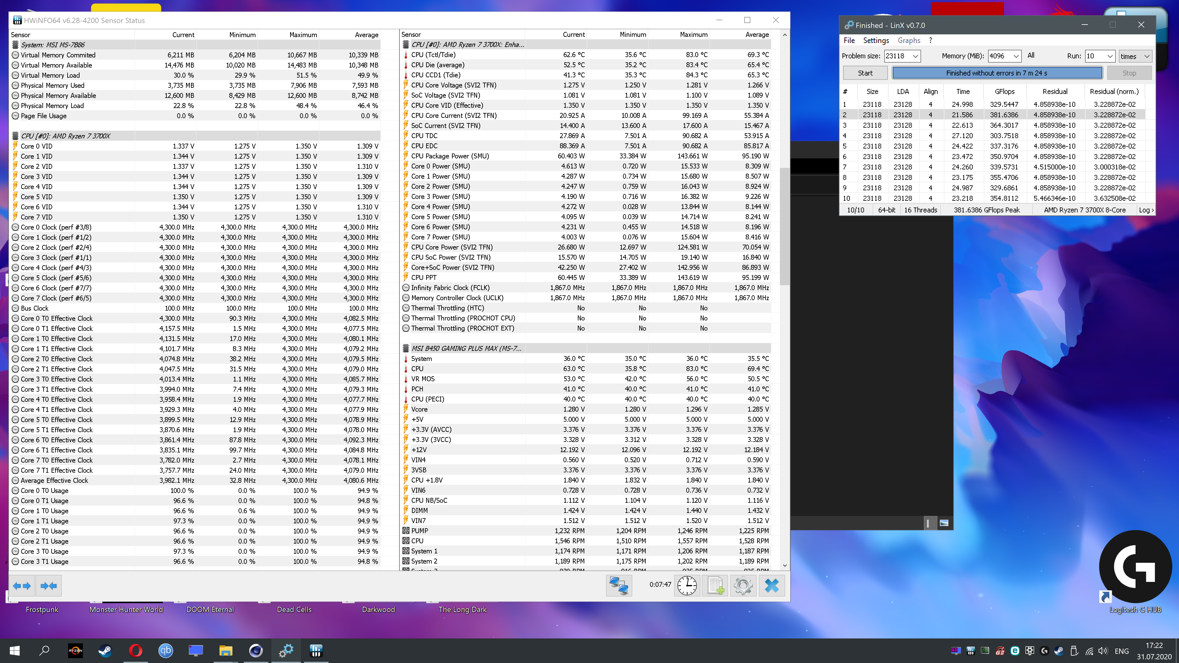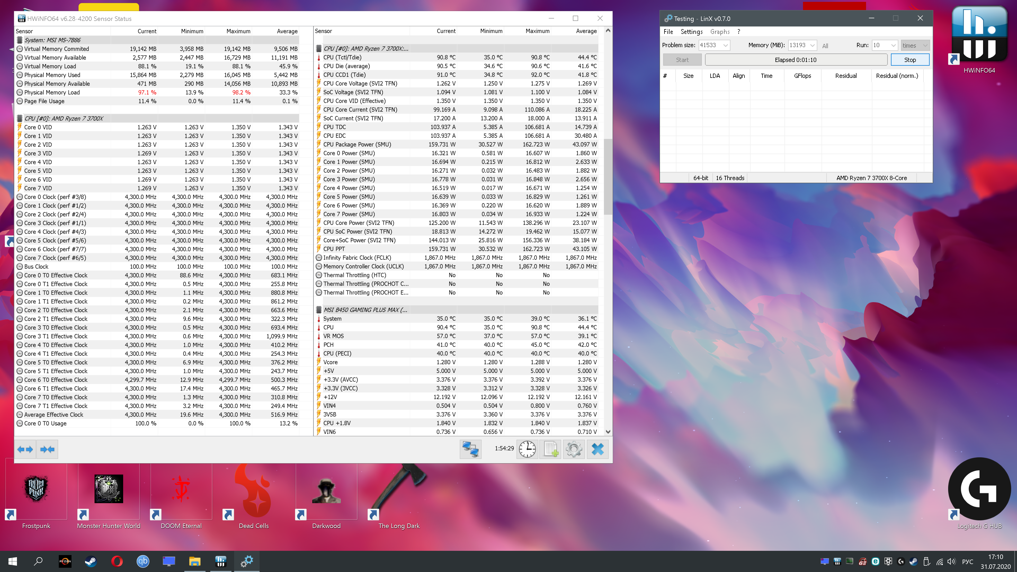вот результат как и вы сказали.. память разогнана на 3733 cl 15 с калькулятора.. попугаев видимо чего то не хватает да? в linx первый раз тестил ставил на "all memory" и через полторы минуты перезагрузился комп.. а второй раз тестил как вы сказали ставить 4096мб и шло финишно.. у меня кстати еще и рандомный фриз происходит в игре.. совсем неизлечимо все способы.. через две недели придет мать strix 550 f и посмотрим что дасть.. будет фриз или нет..