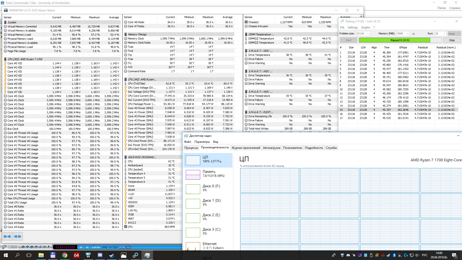 - Обычно поставляется в небольшой коробке без СО. - Штатно имеет базовую частоту 3.4ГГц, частоту 3.5ГГц (технология Turbo Boost) при обычной многопоточной нагрузке (Blender n-cores render) и 3.9ГГц (технологии Precision Boost и XFR) при однопоточной нагрузке (Cinebench R15 single core). - Штатное напряжение питания 1.35В. Может возрастать до 1.4В на отдельных ядрах во время работы Precision Boost и XFR. - Энергоэффективность средняя, требования к СО (TDP) - 95W. Энергопотребление порядка 13Вт в простое и 120Вт в обычной многопоточной нагрузке (Blender n-cores render). - По сравнению с R7 1700 имеет увеличенный промежуток XFR (100МГц вместо 50МГц), а также увеличенные технологией SenseMI показатели температуры на 20 градусов (например, 90 при реальных 70).