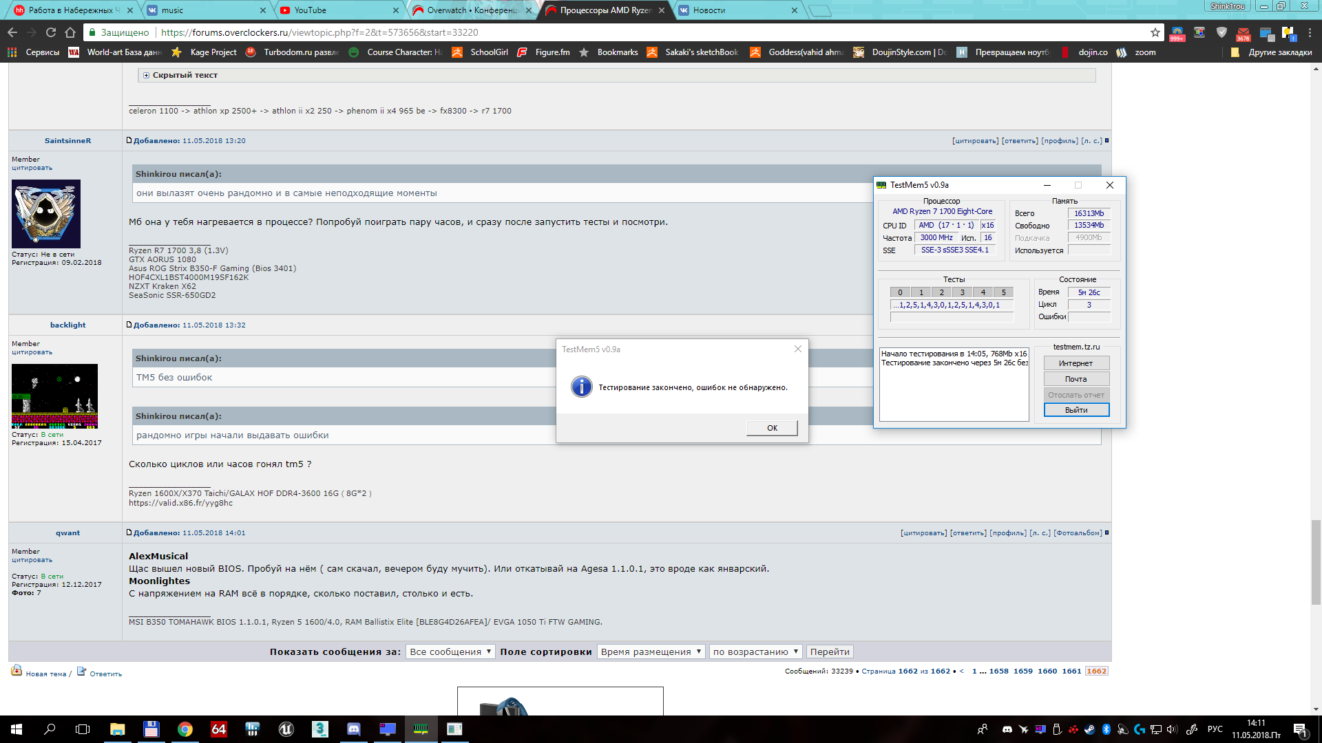 Ребят, подскажите пожалуйста, может кто сталкивался с такой проблемой. Моя сборка: msi b350m pro-vd plus, ryzen 5 1600, куллер gammax 200t, оперативная память corsair vengeance lpx 2666 ddr4 8gb одной планкой(второй пока не обзавелся) на чипах микрон (двухранговая), gtx 1060 6Gb, SSD HDD. В общем стояла у меня версия bios 7B38v22 от 2017-09-26 и процессор у меня был разогнан до 3.7 Гц, оперативная память до 3066 (разгон не сильный, но под мои задачи хватает вполне) и работало все и всюду без нареканий, пока меня черт не дернул обновить bios до последней версии 7B38v28 2018-03-19, после чего у меня на том же самом разгоне и вольтаже pubg стал постоянно крашиться при запуске довольно с распространенной проблемой: We are very sorry that this crash occurred. Please help us track down and fix this crash by providing detailed information about this. В общем если убираю разгон по процу, оставляю разгон по памяти, то все работает идеально, как только выставляю в ручную хотя бы даже 3.4 Гц по процу, игра крашиться и не запускается, пробовал отключать всякие энергосберегайки, турбобусты, вольтаж пробовал вручную выставлять в пределах нормы на CPU Core до 1.300V, на CPU NB до 1.190, DRAM Voltadge до 1.400 пробовал понижать напругу на один шаг и на авто вольтаже пробовал, ничего не помогает, кроме отключения вообще разгона процессора. Температуры в норме, в аиде и в стресс тестах прогонял проц и память, все ок (сама винда работает и другие программы и игры тоже вроде пока работают), пробовал переустанавливать игру на ssd и hdd, пробовал переустановить windows, directx, с++, Драйвер nvidia, удалял антивирь (хотя тут дело конечно же не в этом, но все же попытка не пытка) В общем проблема связана конкретно в разгоне процессора, без его разгона все пашет. Может кто знает, где нибудь в недрах нового bios зарыта настройка какая либо, которая все портит, но я уже крутил все что только можно в other setting. Заранее спасибо за ответ.