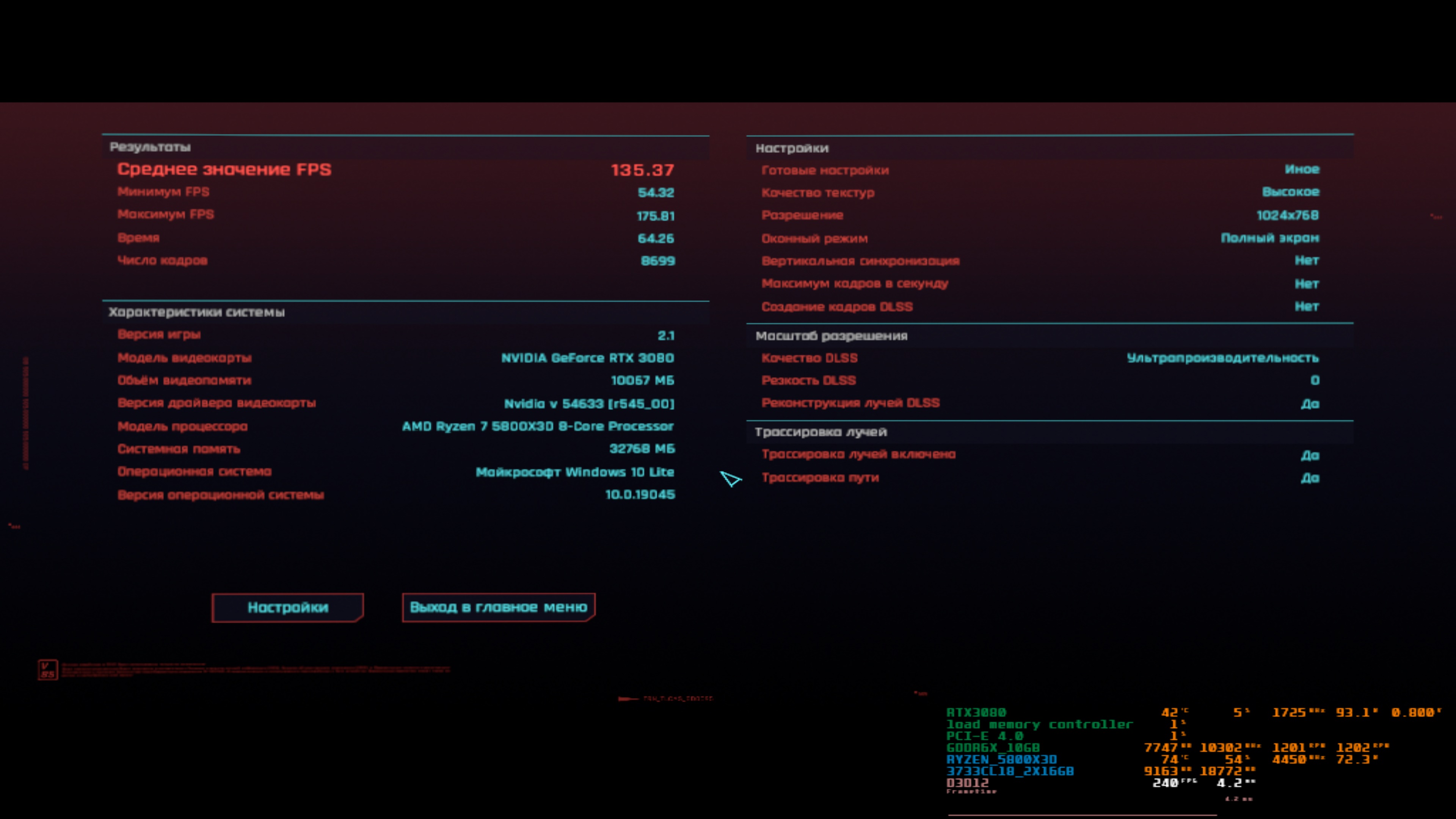 Cyberpunk 2077 v2.1 - чисто тест процессора 5800X3D (на ryzen 5 1600X 4000 средний был 32fps ) ультра настройки (ползунки до упора) + трассировка пути + RR вкл + толпа максимум.