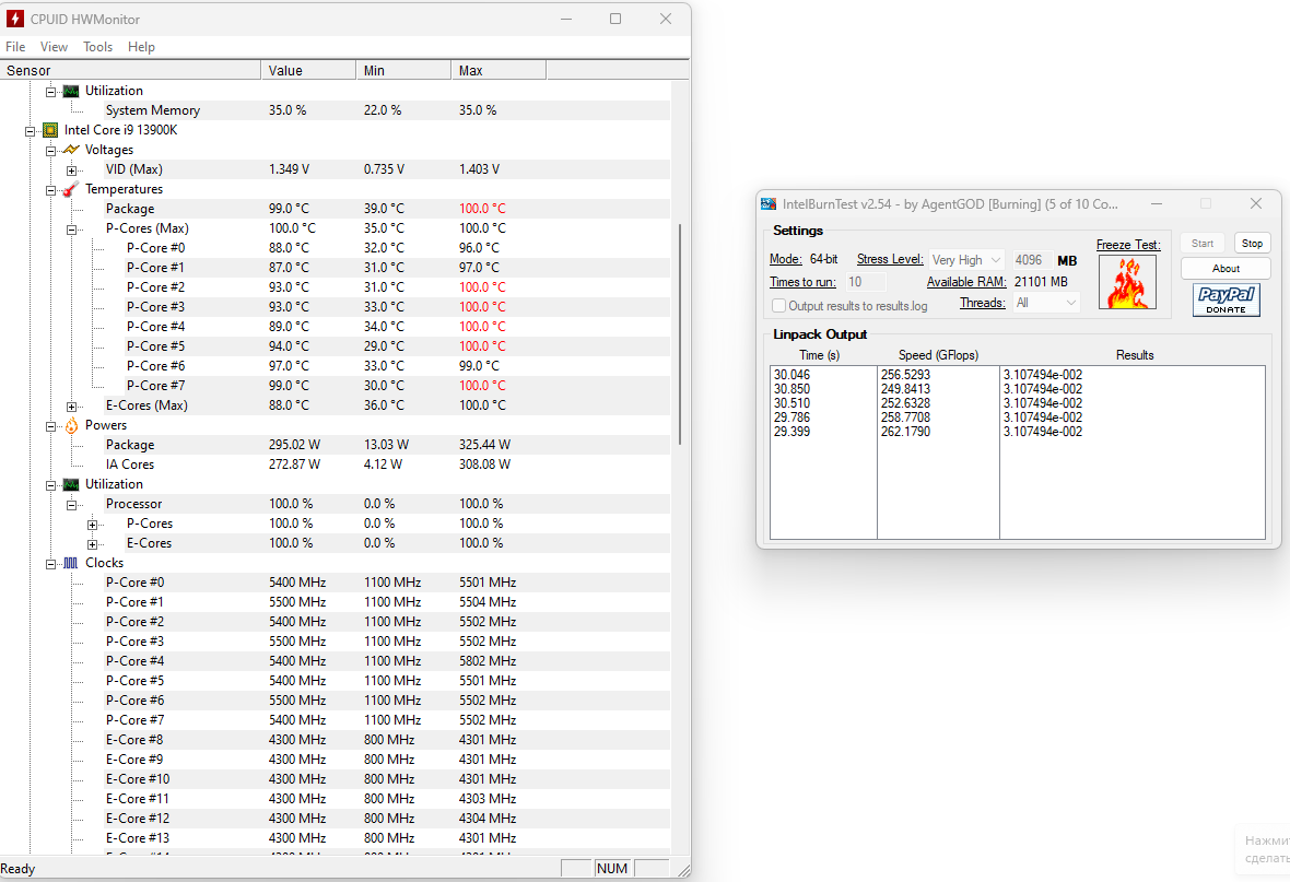 У меня вопрос по охлаждению проца 13900K. Стоит водянка ID-Cooling Frostflow X-360, запускал Intel Burn Test, лимит потребления материнка сама выставила ~ 300 W, соответственно в него и упирается. По ядрам греется до 100 `c, временами по ним уходит в тротлинг. Но всё же вытягивает тест с таким потреблением без ошибок. Как этот результат? Нормально по охлаждению, или водянка не очень? Про горячий нрав этих процев вроде как известно, но всё же реально ли немного эти температуры понизить? В повседневных задачах в принципе проблем нет...