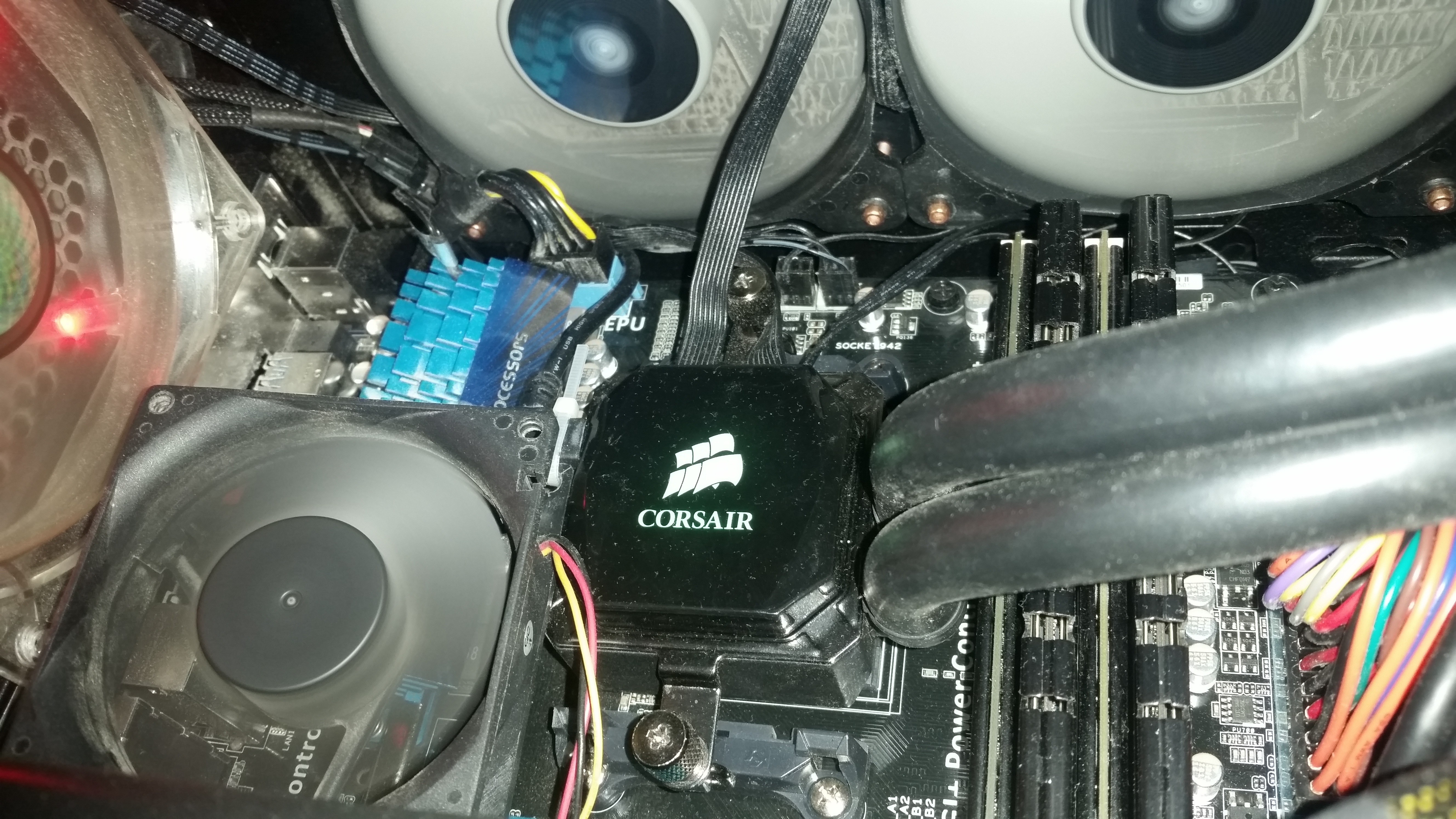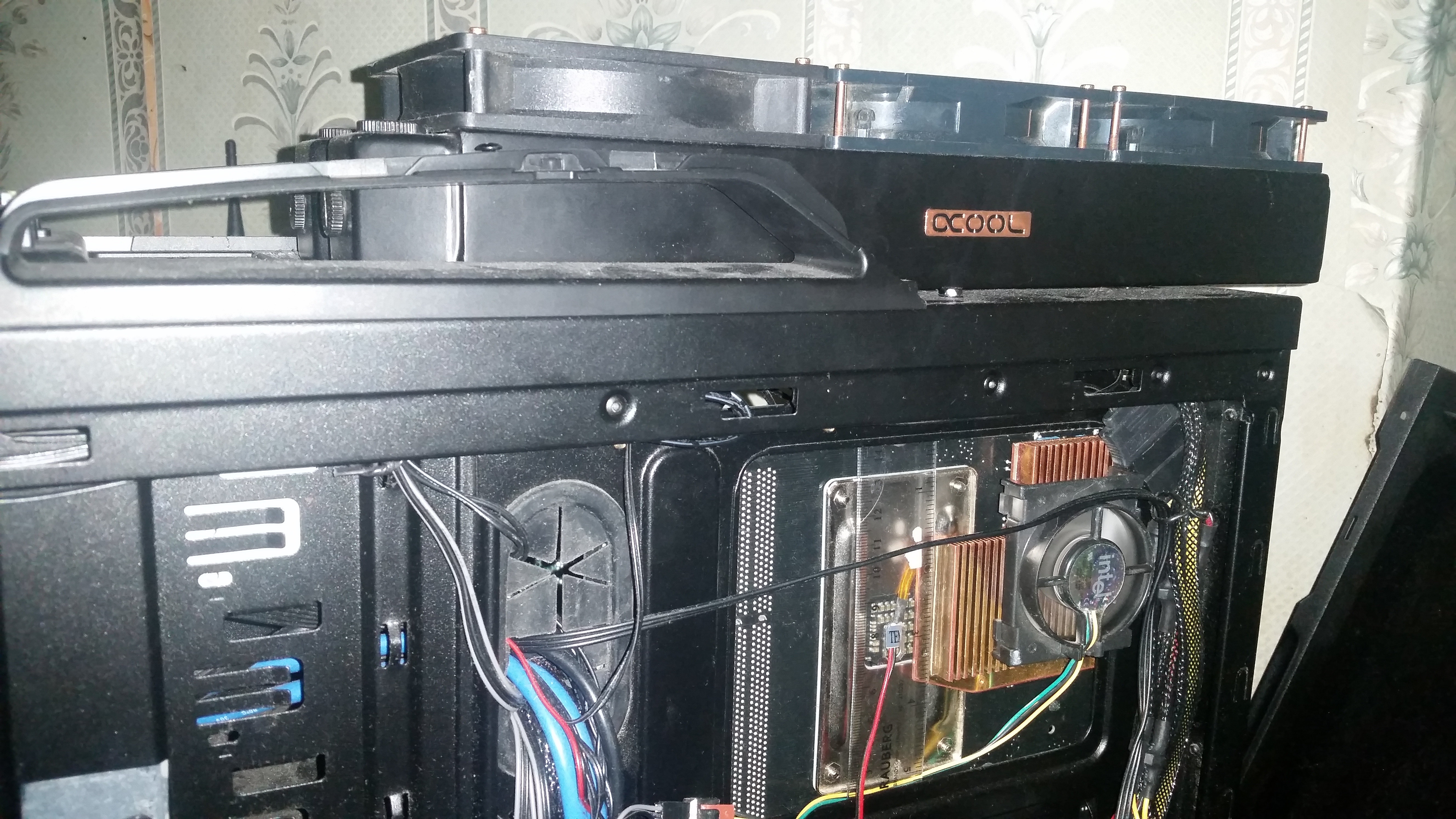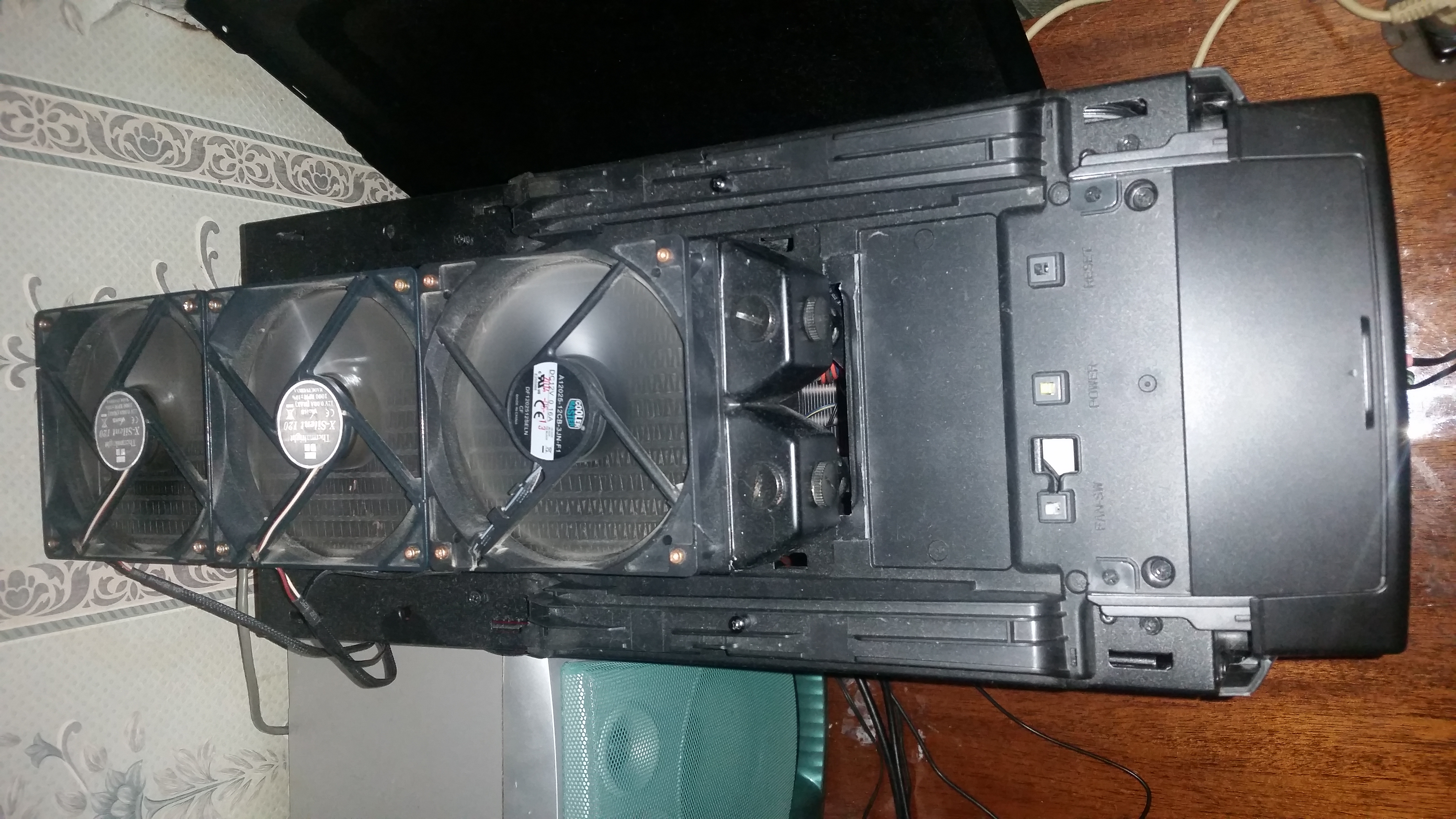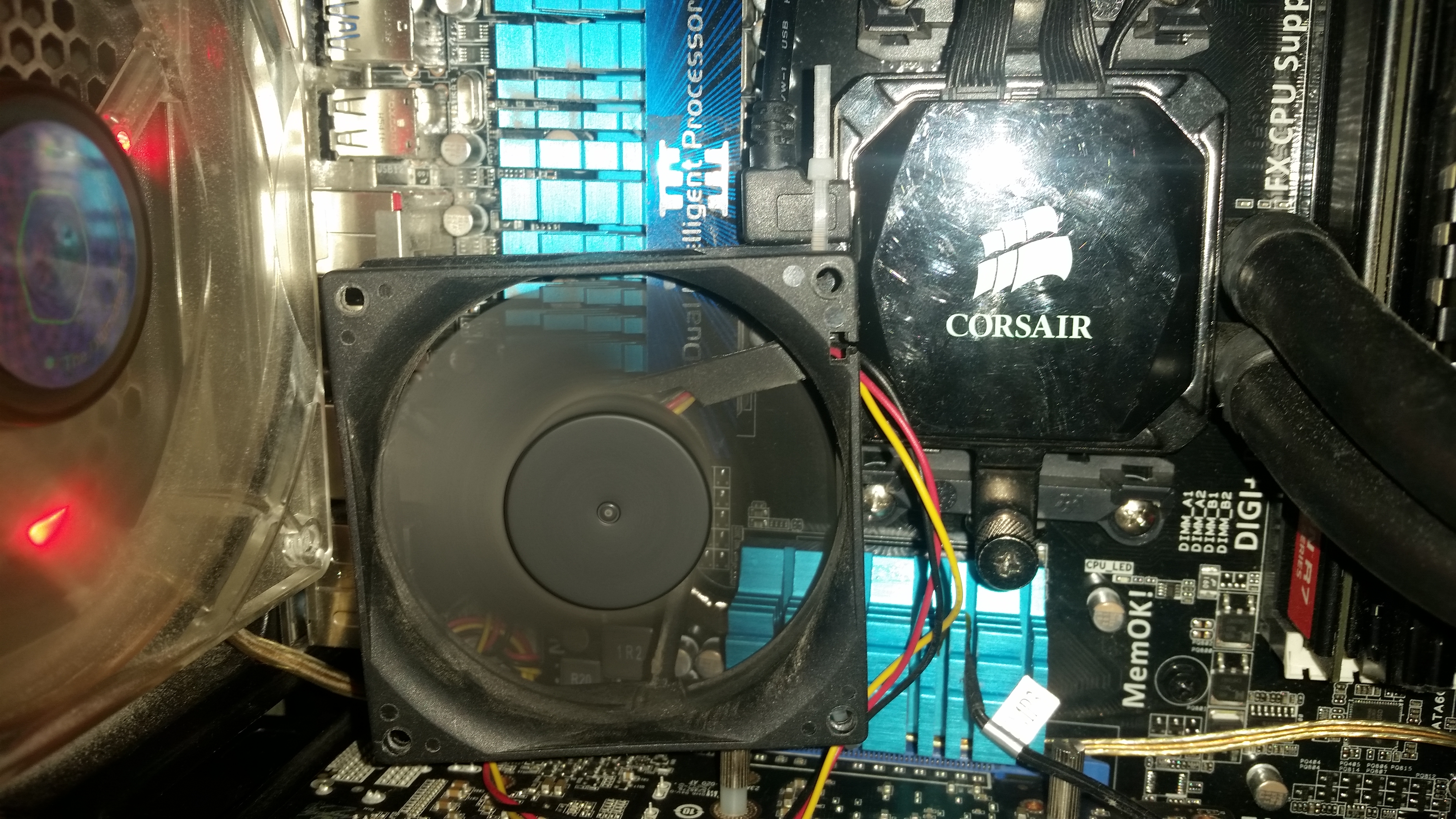 я смотрю тут колхозными пипками меряются, ну так добавлю свои 3 копейки, гопнул X1650 Pro на радиатор, откопал 80ку и реорганизовал охлаждение цепей питания и мосфетов на обратной стороне мат. платы, 80ку тупо вкрячил на пару стяжек к тому что под руку попало, а попала всякая фигня типа северного моста и кабеля от Corsair Link, с обратной стороны защемил радиатор между термопрокладками наложенными на мосфеты (почему гугл не знает этого слова? 0_о), линейкой и корпусом, держится как будто уверено, но в футбол играть рано, по эффективности - температура на питальнике и мосте упала и держится на 37 в обычном ритме и доходит до 45 (смело прибавляем градусов 10, термодатчики налеплены на радиаторы) под нагрузкой, зато заметил что теперь у меня выделяется южный мост по температуре доходящий до 55 под нагрузкой (полагаю вина рэйда), в целом апгрейдом остался доволен, в линкс играться не пробовал, зато температуры на реобасе перестали наводить ужас и тоску, да и камень под нагрузкой выше 45 не показывает
