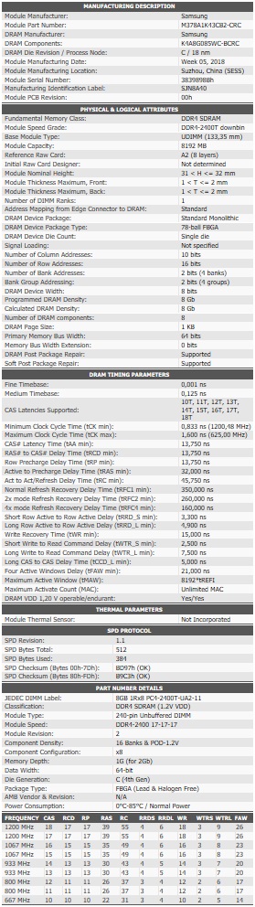 Здравствуйте, помогите с Ryzen DRAM Calculator 1.2.0 Beta 2. Использую 2 зеленые плашки памяти Samsung 8GB DDR4 PC4-19200 [M378A1K43CB2-CRC] Thaiphoon Burner говорит что это 8 Gb C-die (18 nm) / 1 die и в ней нет В ней нет XMP профиля.