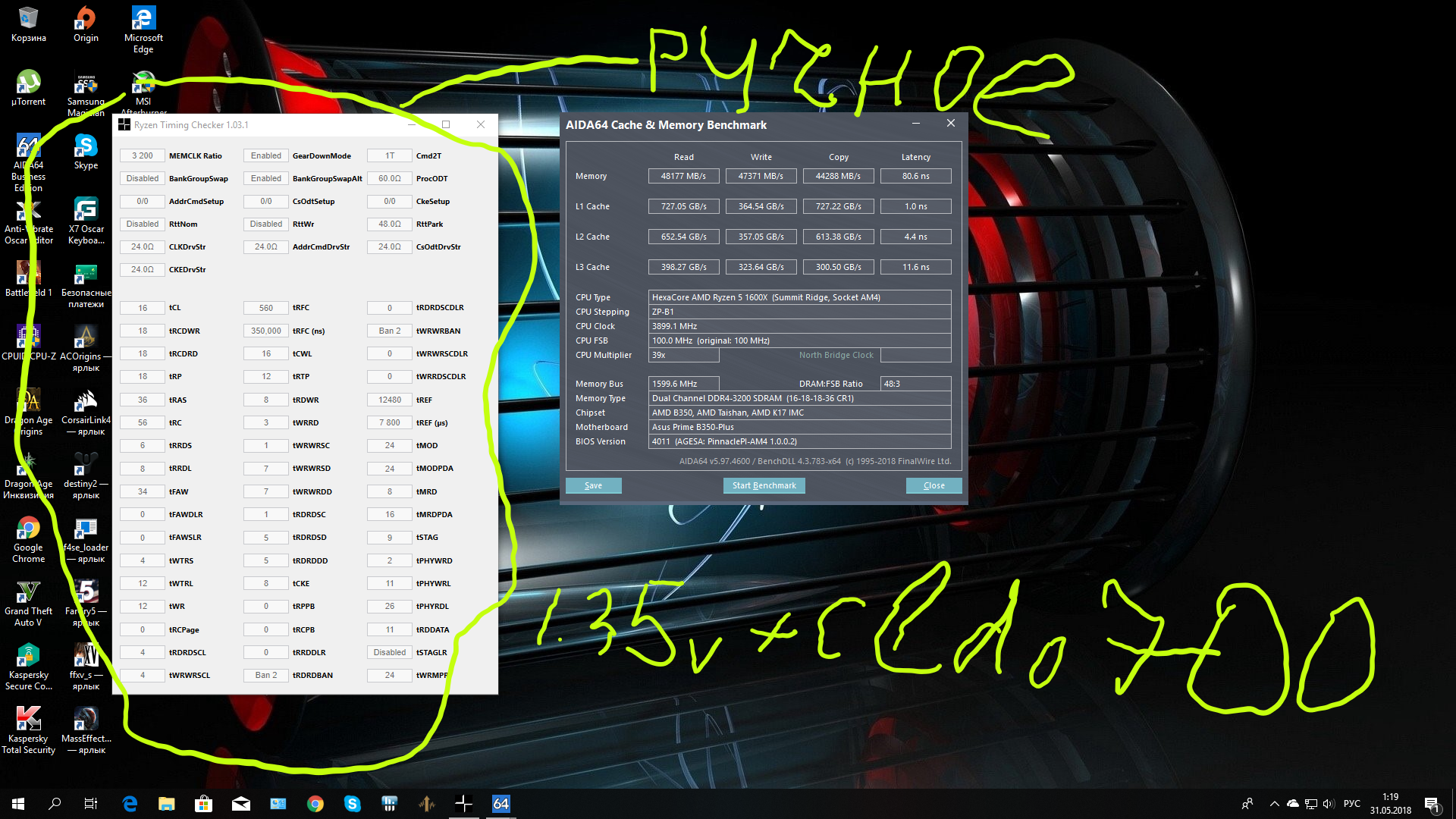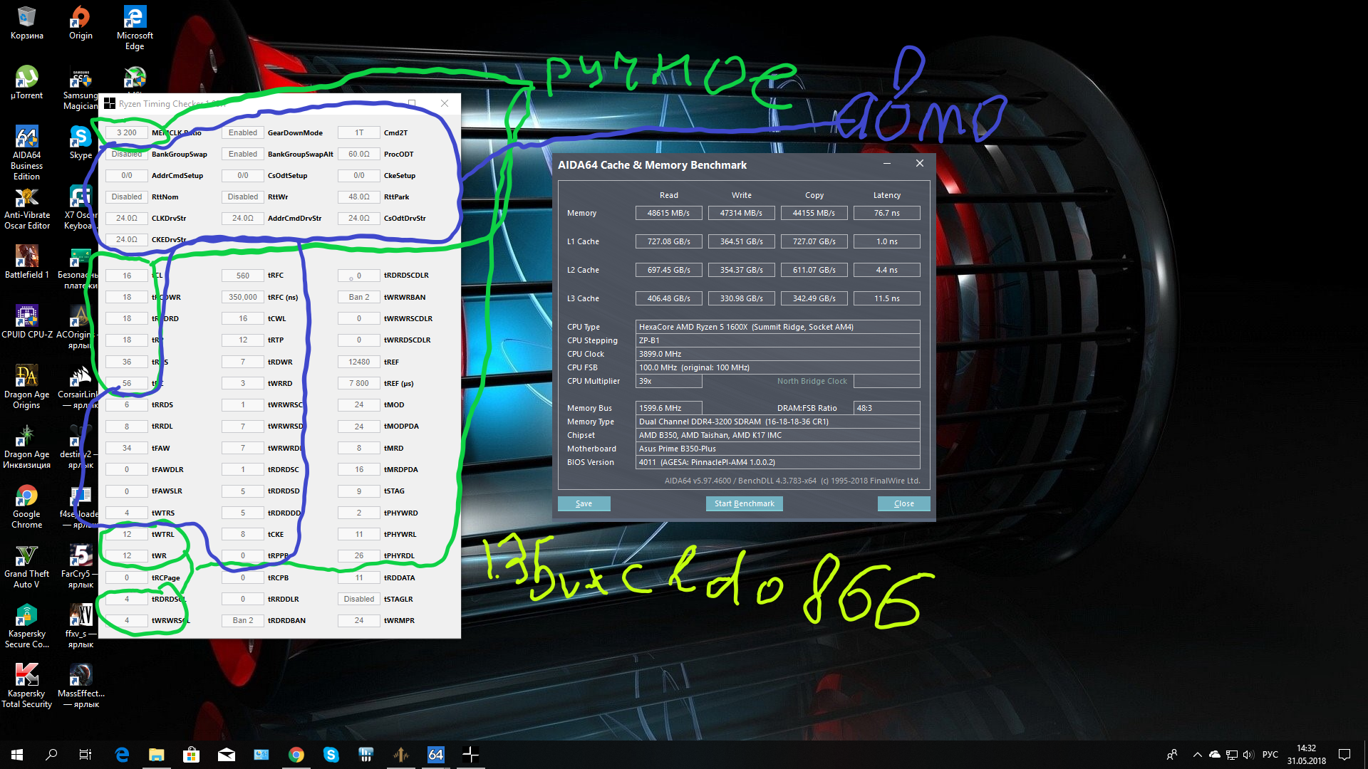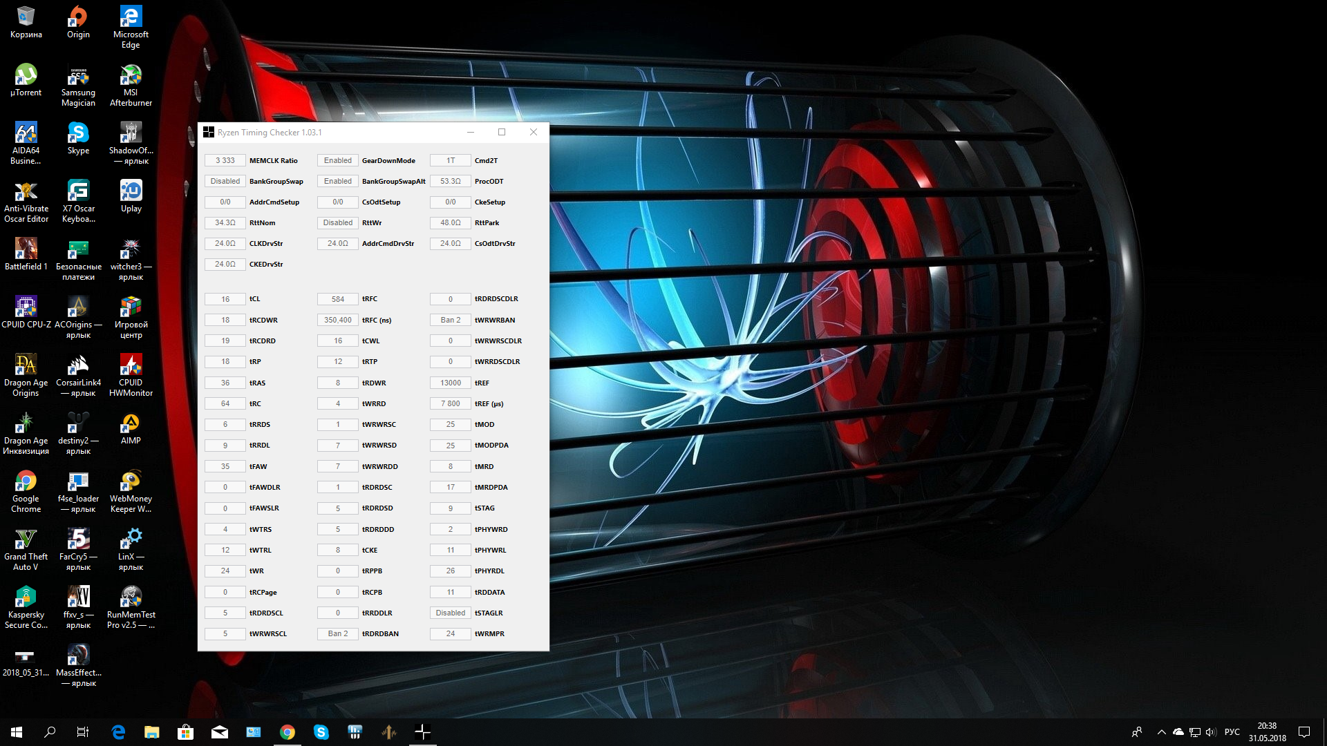 Ребят, салют! Пытаюсь разогнать память G skill RIPJAWS V 2400 c15d 16gvr до 3200 но все тщетно, использовал настройки на safe mode в калькуляторе как рекомендованные так и альтернативные, система не запускается. Сумел своими силами разогнать память до 2800 с таймингами 16-15-15-15-35, 1t, Trfc 280, Soc 1,1v и напряжением 1,36, при 1,35 не заводится. Прошу помочь разобраться как разогнать данную память. Возможная проблема в том, что thaiphoon показывает производителя Spectek, но чип b-die, а калькулятор считывает производителя как самсунг. Поднимал вольтаж до 1.39 и таймингами 18-18-18-38 до 3000ghz синий экран. процессор ryzen 2700x, asus x470 prime
