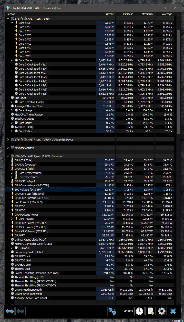 icetest3 Сейчас добрался до компа, глянул. Я сильно не жестил со своим 5700Х, ставил у себя при дефолтных настройках оперативки на 3200 МГц для SoC 0.880 вольт, но на минимальном автозадирании платой вольтажа это превращается в 0.888. Я полагаю, если задаться целью, то можно ещё ниже опустить с сохранением стабильности. На частоте 3800 МГц пришлось задирать до 1.266 вольт, а на 3600 - 1.248 вольта. Так, к слову и в порядке ориентира. Что до частот процессора. Базовая частота не падает ниже номинальной - 3600 и это нормально. Но есть "эффективные частоты" и они опускаются до ничтожных значений. И это тоже нормально.