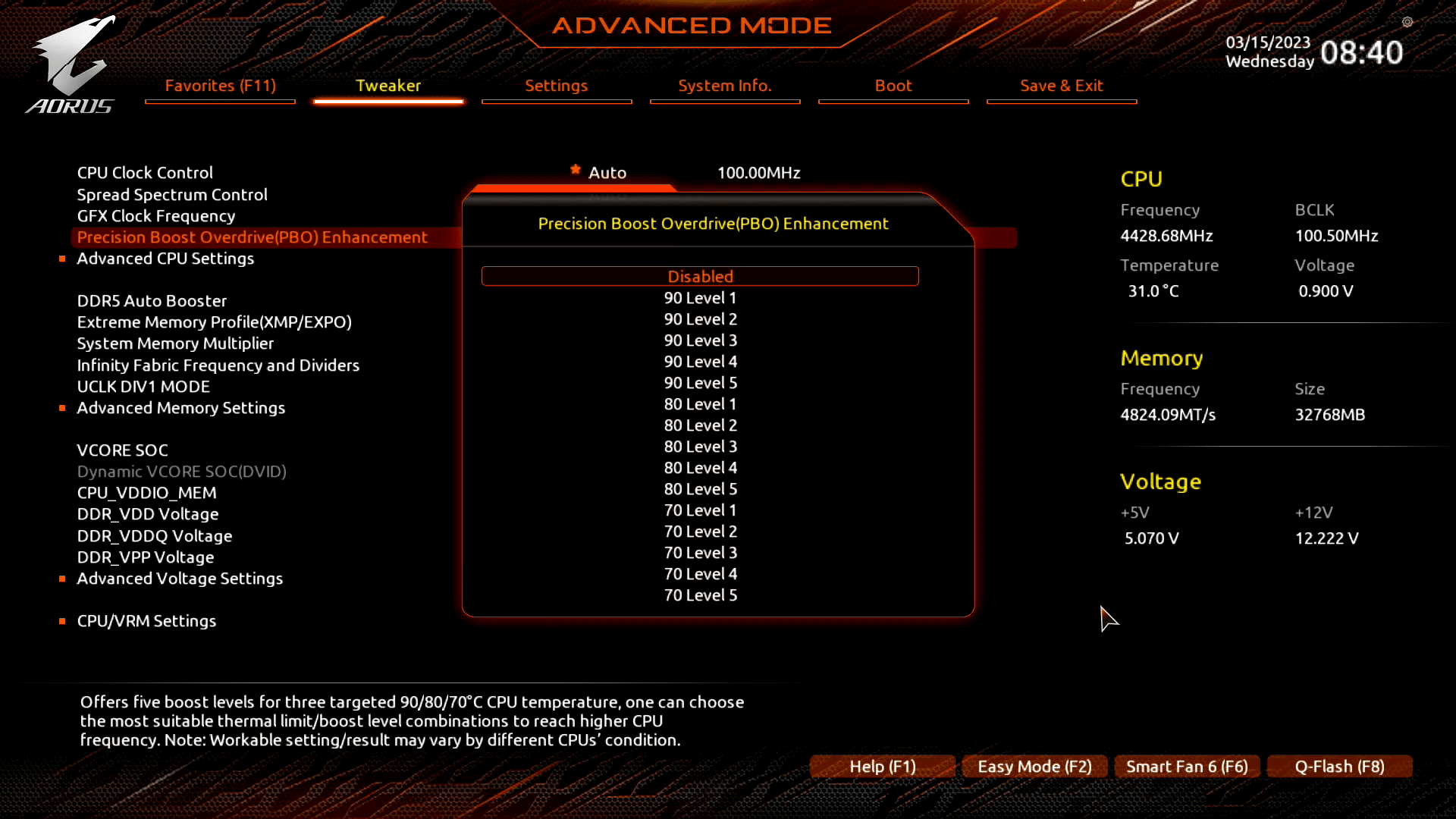 Удаляй вообще райзен мастер. Всё в биосе делается. То, что на скрине - это упрощённый вариант с быстрым доступом. Ставь 70, температура будет не выше 70, а Level подгоняй сколько у тебя курву проц держит. Level 5 это курва -50, Level 1 курва -10