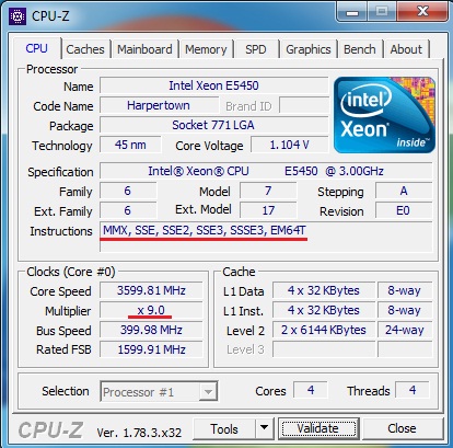 Сегодня забрал с почты и тут же установил в сокет платы GA-P35-DS3 rev 2.1, предварительно перепрошив биос на китайский (проц ведь тоже с китая!). Система завелась, стартанула,и даже запустилась! Но вот беда: богомерзкий CPU-Z утверждает (видимо из-за зависти), что инструкции SSE 4.1 и VT-x не поддерживаются, и множитель не переменный. Не беда, прошил биос от IDEAfix, результат тот же. Ну и ладно, добавлю нужные микрокоды сам, по инструкции,и все заработает. Но нет. Винда 7 32. Пока всё работает стабильно, но CPU-Z... Что делать????