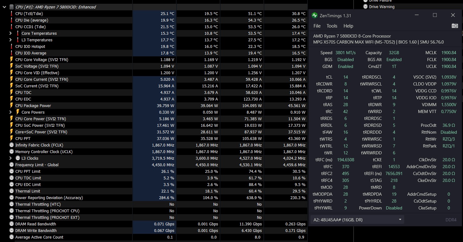 Делюсь болью и страданиями! В начале 2021 года купил я 5950X и материнку ASUS X570-I всё настроил спустя пару месяцев, радовался. Спустя пол года начались приколы, за неделю разок проскакивали ошибки WHEA Logger, по одной, потом через пару месяцев вообще критически ошибки WHEA Logger начали появляться и ребуты, причём под малыми нагрузками при просмотре видео или ютубчика, или при свёрнутой игре на паузе. После перепаковки водоблока на видюхе остались термопрокладки Gelid GP Ultimate, разобрал материнку, поменял термопрокладки на VRM, на обратной стороне VRM и на чипсете и вуаля, всё как рукой сняло. Напряжения CLDO VDDP, VDDG IOD, VDDG CCD получилось снизить до старых пределов. Какая связь между WHEA и охлаждением материнки я ХЗ. Но изначально начало помогать тупо обдув вокруг сокета 120мм вентилем. Теперь и без вентиля работает. Посмотреть бы на материнку в тепловизор.