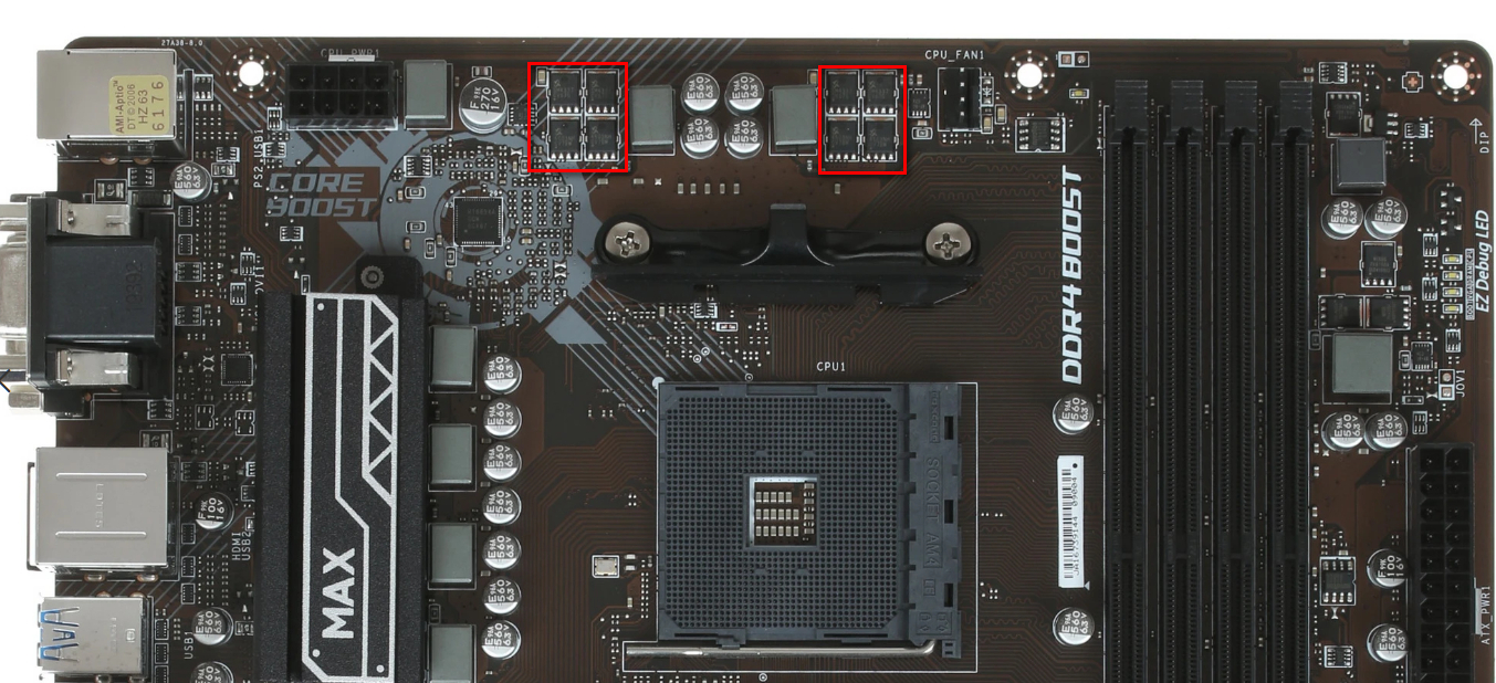 Еще занятный момент, что даже у более дорогих плат (из линейки гигабайт) с более мощными преобразователями питания ядер, фазы графики все так же не накрыты радиаторами и по сути представляют из себя ровно то же самое. Там радиаторы полностью закрывающие все мосфеты начинаются с платы ценой в 11 тыс. Что для такой очевидно бюджетной системы для несложных задач со встроенной графикой уже не имеет смысла.