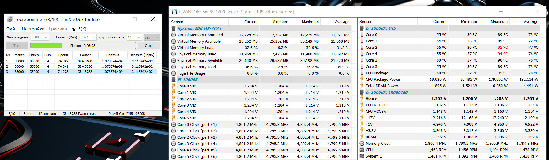 это средний экземпляр, здесь походу у всех такие напруги, вот мой OEM i5-10600kf, купленный в рандомном магазине 4.8 держит под нагрузкой в linx на 1.194v, потребление при этом в районе 175W, температура самого горячего ядра 91°C
