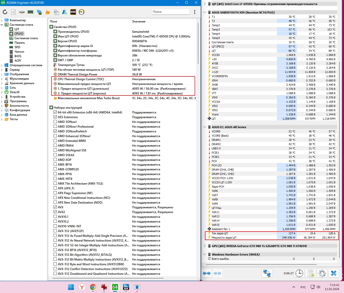 и какие лимиты показывает XTU или QuickCPU и расширить их соотв при возможности. Также поэксперименть, как будут дела при отключении HT либо ядер у проца. + на всякий/ на асус_x99+8пин+250W(130A по HWINFO↓) на проц на десктопном 10 ядернике(без HT) не отключается/ Может у тебя по Aмперам=TDC отрубает