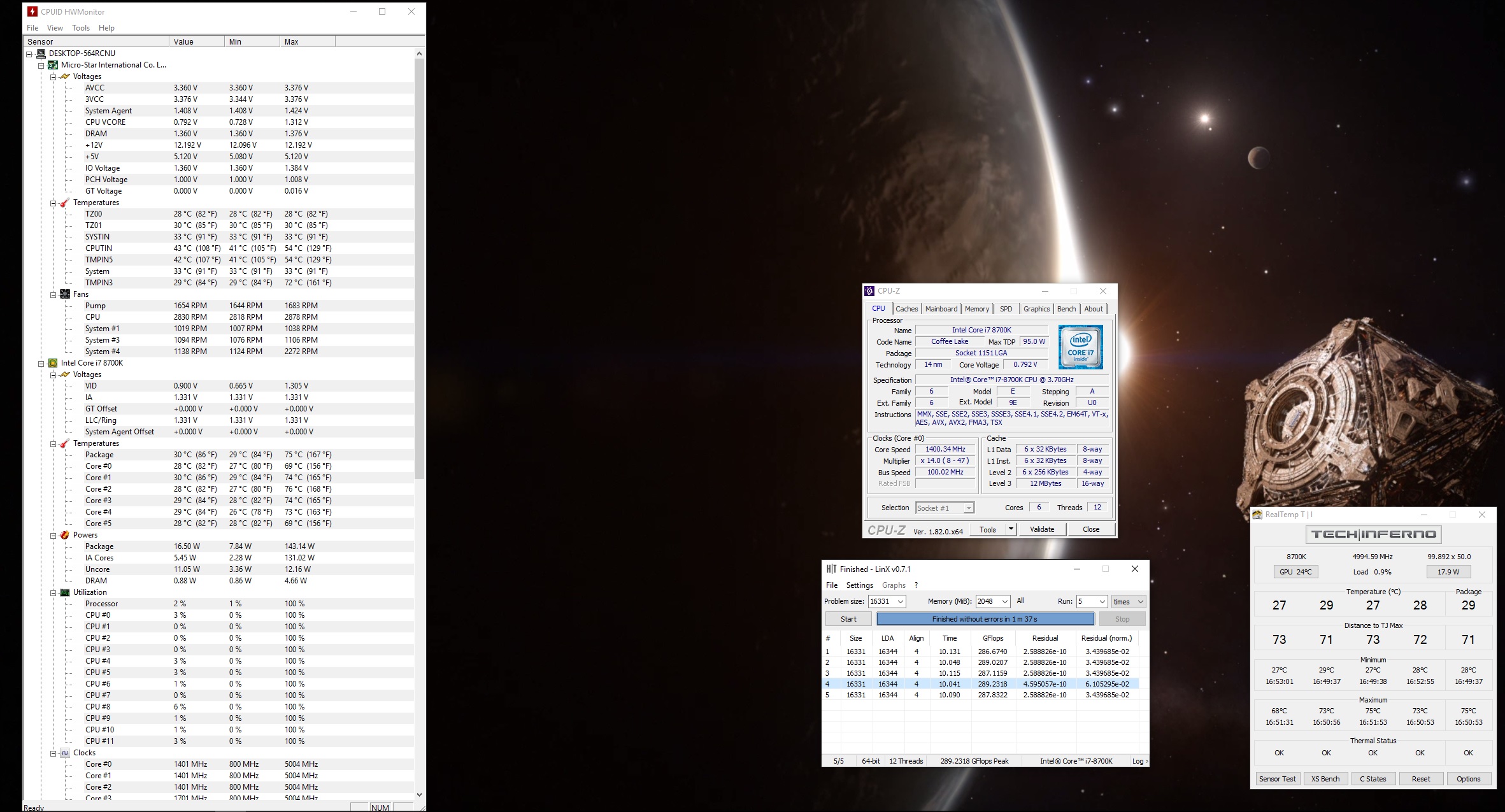 Полученный результат должен иметь следующий вид: Скриншот рабочего стола после прохождения >9 циклов (т.е. между 9 и 10 проходами). Вместе с LinX на рабочем столе должны быть развернуты CPU-Z (первая вкладка) и Core Temp, это обязательный минимум. Такой набор программ даст информацию о напряжении и температурах под нагрузкой-простоем. По желанию можете добавить другие программы, показывающие дополнительную информацию о вашей системе, например третью вкладку CPU-Z, которая покажет модель материнской платы и версию BIOS. Пример результата разгона: Mad Max, 5100 МГц (AVX 0), i7-8086K, HT-ON, Cache 4700, Vcore=1.36V, Batch L805E123, Gigabyte Z370 Aorus Gaming 7 (bios F6), Be Quiet! Dark Rock Pro 4, ЖМ под HS, Windows 10 Pro 64-bit 1809, LinX 0.9.3 64bit.