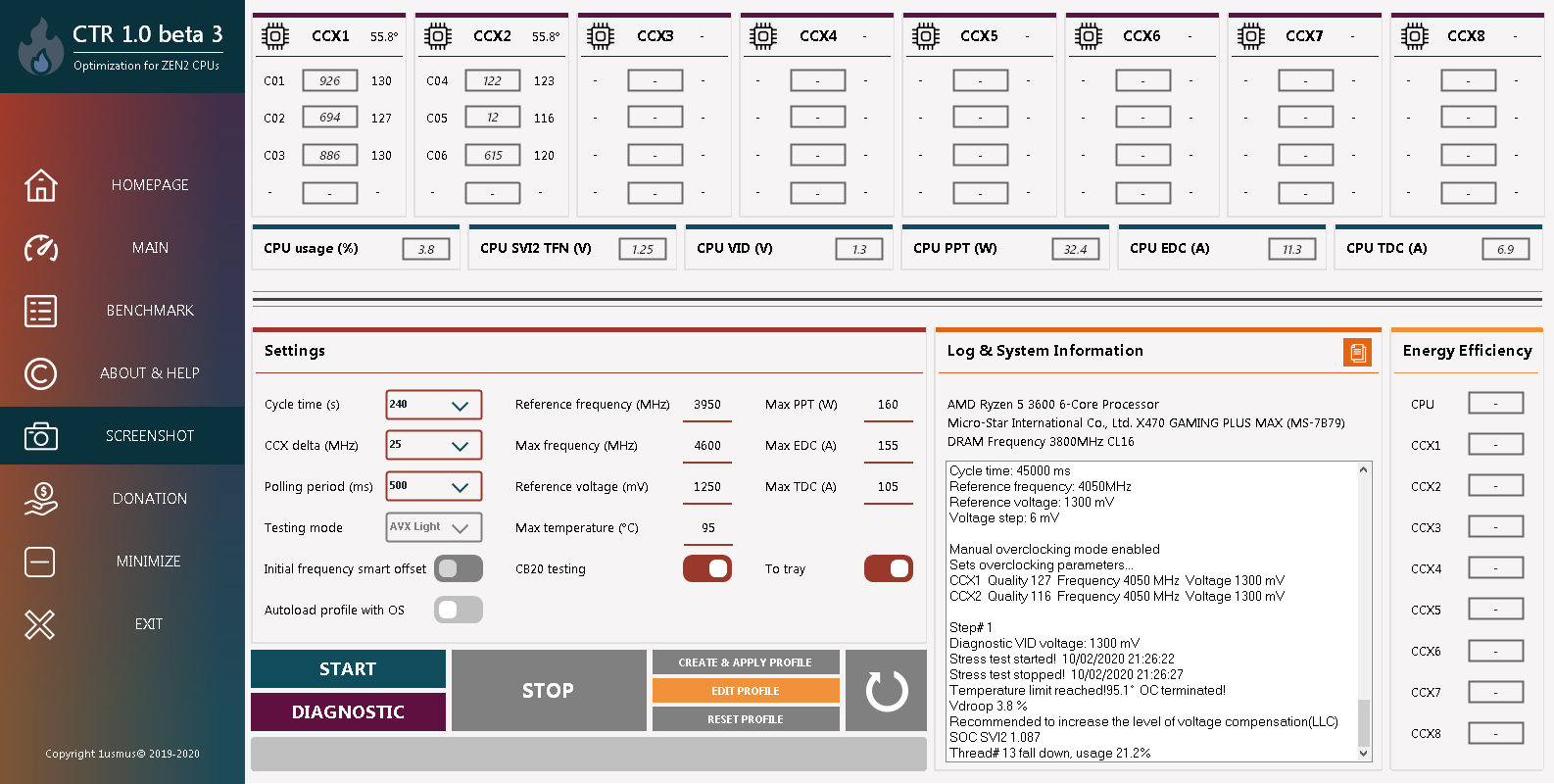 Попробовал CTR. Неоднозначное впечатление. Процессор 3600 из первой партии и ручками у меня выставлено фикс 4200 при 1.26В Поставил в уефи все нужные настройки. Прогу установил также по инструкции. Запустил диагностику - частота 4050, напряжение снизилось до 1.0 В - перезагрузка. Запускаю еще раз - опять до 1.0 В - перезагрузка. Теперь запускаю разгон на дефолте(1.25В) - доходит до 4425 - перезагрузка. Еще раз - до 4450 - перезагрузка. Вернул ручной разгон. По поводу программы сформировалось мнение, что она в принципе не нужна тем людям, которые могут войти в уефи.