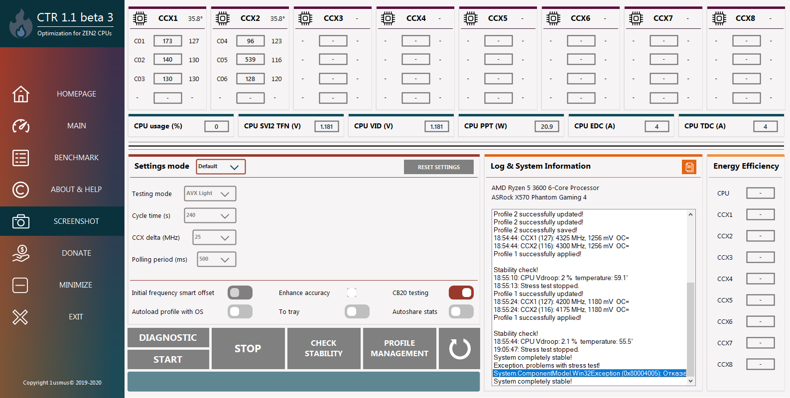 Здравствуйте господа. вопрос: чисто гипотетически может-ли немного ошибаться CTR v1.1 ? сейчас прошел диагностику. программа пишет что у меня бронзовый экземпляр камня, и рекомендует 4.1gHz при 1.25v (проц R5 3600 куплен в декабре 19года) ну ОК. стартую. итого: CCX1 4.100Hz , CCX2 4.125Hz при 1.256v как-бы неплохо так-то! НО! вот уже пару месяцев я руками ищу минимальный вольтаж при максимальной частоте.(волшебные заклинания и танцы с бубном помогают) за это время удалось нащупать 4.2gHz при 1.25v. при этом все тесты система проходит.в играх то-же все хорошо. почему так? программа перестраховывается?
