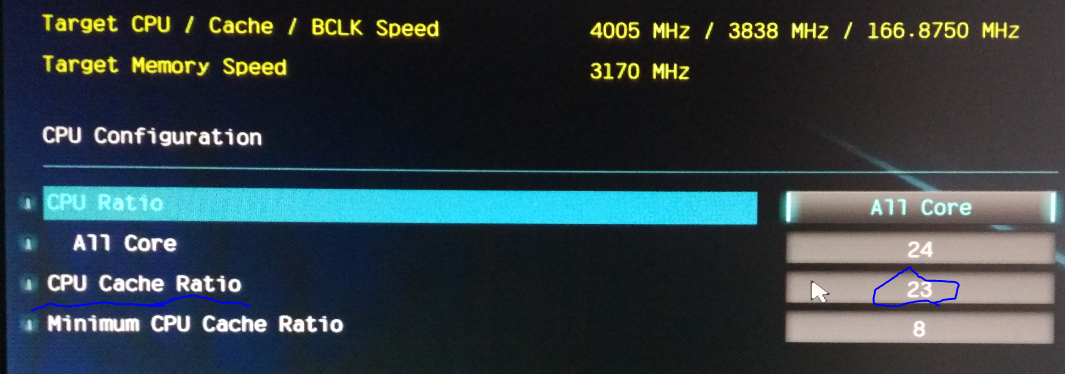 как вы делаете такие офигительные скрины с биоса? видно что не фотка, а реальный скрин. по поводу кеша то скорее всего у вас множитель на кеш меньше стоит нежели на множитель на частоту ядра.