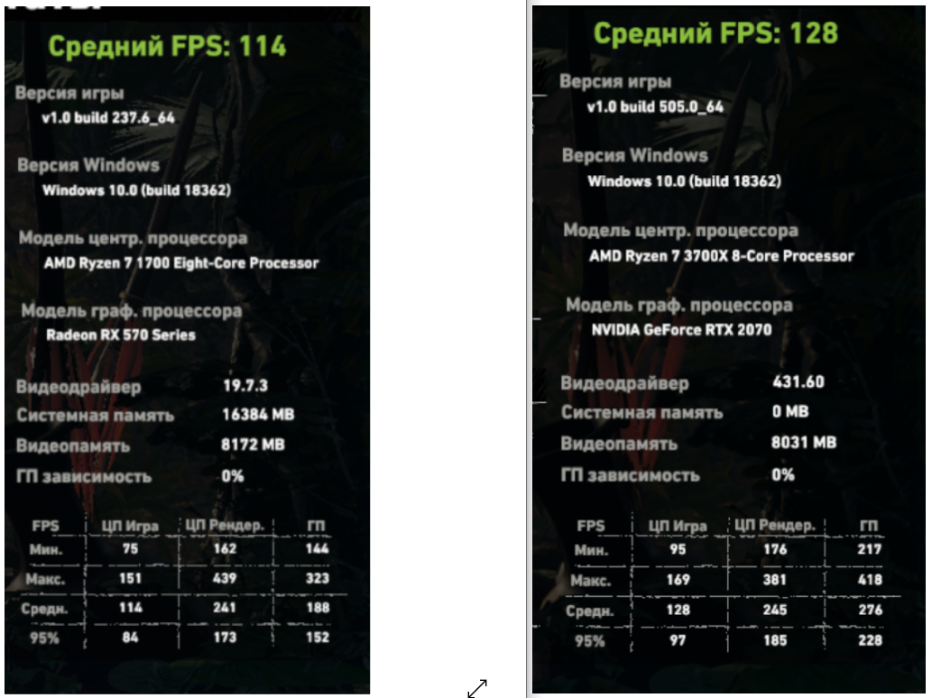lameover у меня память 2666,процессор 1700-3.6ггц Вот и сравни резалты со своим..разрешение 720р Короче явно Нвидия карты режут 3700х производительность