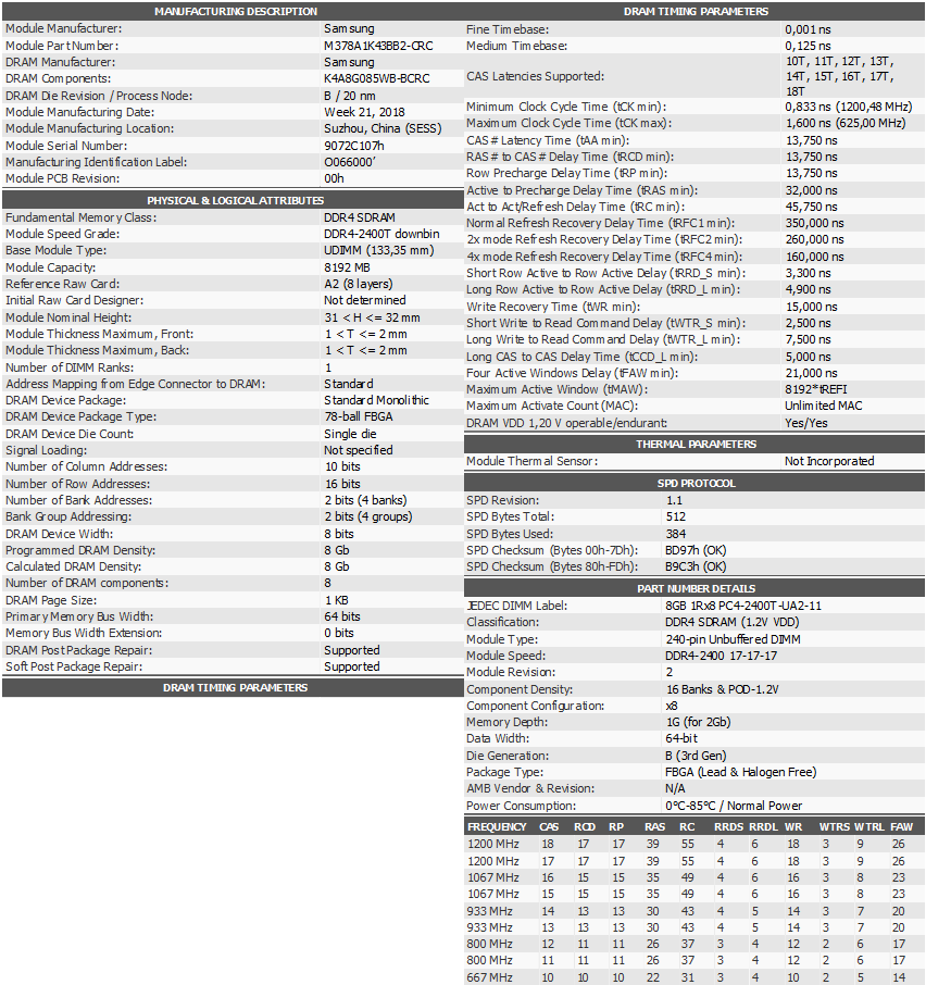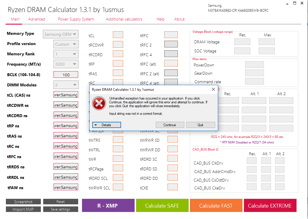 как так хиникс? у меня Samsung [M378A1K43BB2-CRC] 8 ГБ (1 планка) в Б2 воткнул. По программе Thaiphoon burner и статье по поиску b-die это память с чипом самсунг. На каком мемтесте вылазит эта ошибка, то тест не идёт дальше. Сначала была ошибка вот с этими "минусами" и чисто цифры, ставил bas (все) по 30 ом, запускаю тест, ошибок нету, через минуты 2-3 вылетает в экран смерти. vDram - 1.37 Proc - 60 ом SOC (offset mod) режим "-" 0.075 Тайминги 18-17-17-39 (всё остальное на АВТО) Материнка Asus prime B350 Plus Ссылку по поиску b-die кинул в ЛС. В твоей программе, у меня не определяется почему-то некоторые параметры